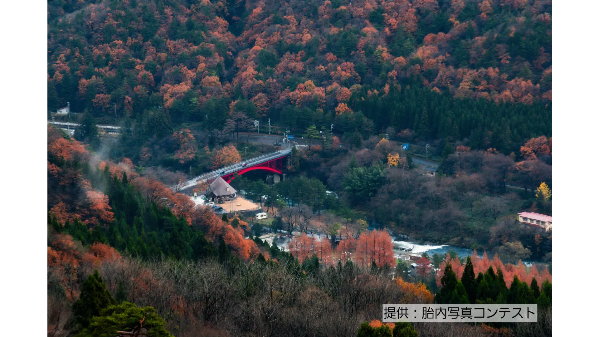 道の駅胎内から胎内観音を見上げた時の広葉樹と針葉樹のコントラストの美しさ。天気が良く光が差す時間帯は、紅葉を照らし色彩がより鮮やかに見えます。