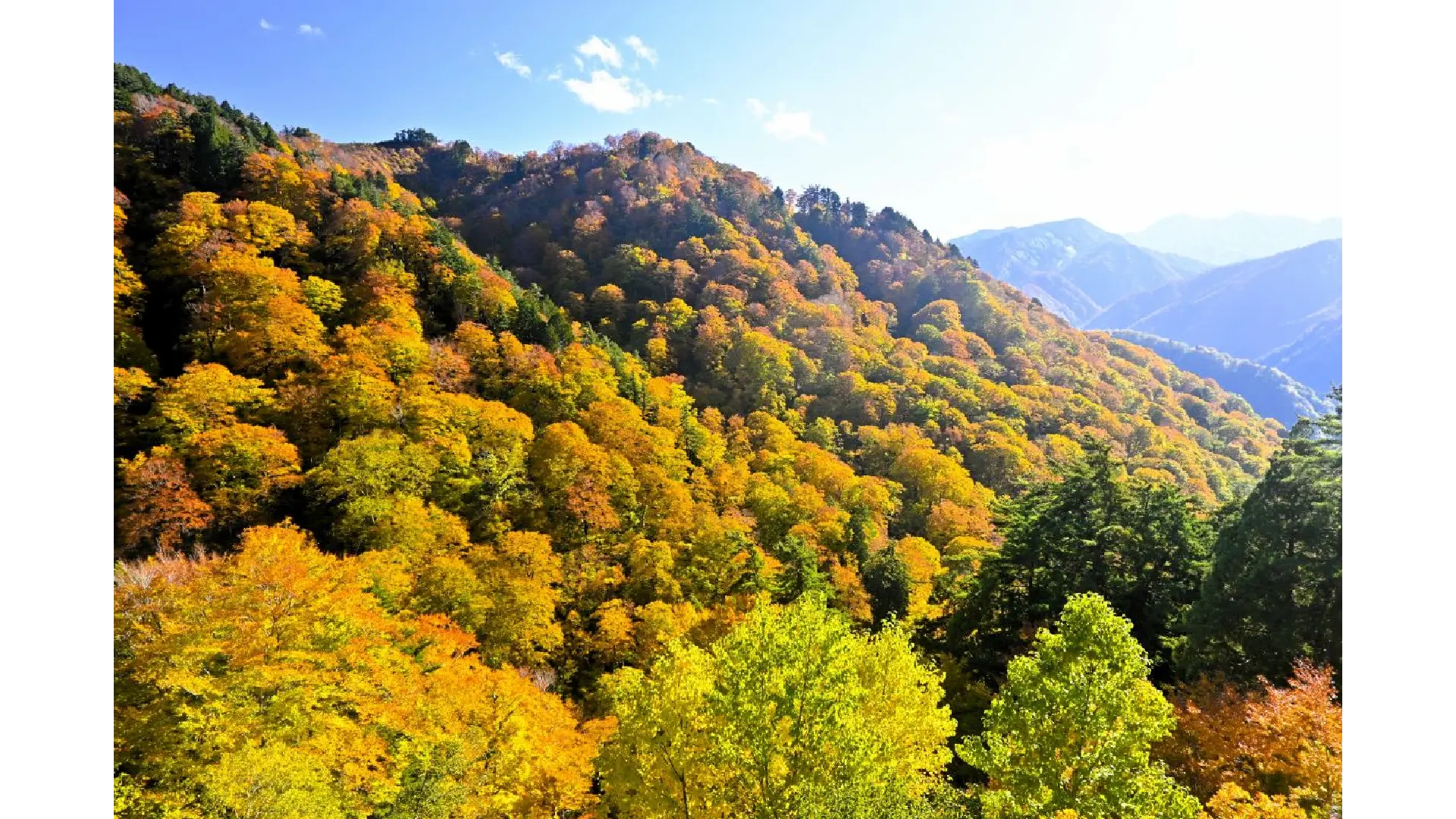 白山白川郷ホワイトロードは標高差が900mと大きいことから頂上から始まる紅葉が起点に下りてくるまでの間、約1か月にわたり見頃の紅葉を楽しむことができます。三方岩駐車場付近では広大な原生林の紅葉と北アルプス連峰の遠望、栂の木台駐車場では眼前に広がるブナ、ミズナラ等の原生林とヒメコマツ、オオシラビソ等の針葉樹に混ざりヤマウルシ、ナナカマドなどの紅葉が、10月下旬には初冠雪の白山を望めることもあります。さらに、蛇谷8景と言われる峡谷沿いの紅葉は、7つの大きな滝と清流、岩壁・断崖に織りなす草木類の草紅葉と常緑樹の緑のコントラストも見応え充分のまさに絶景です。