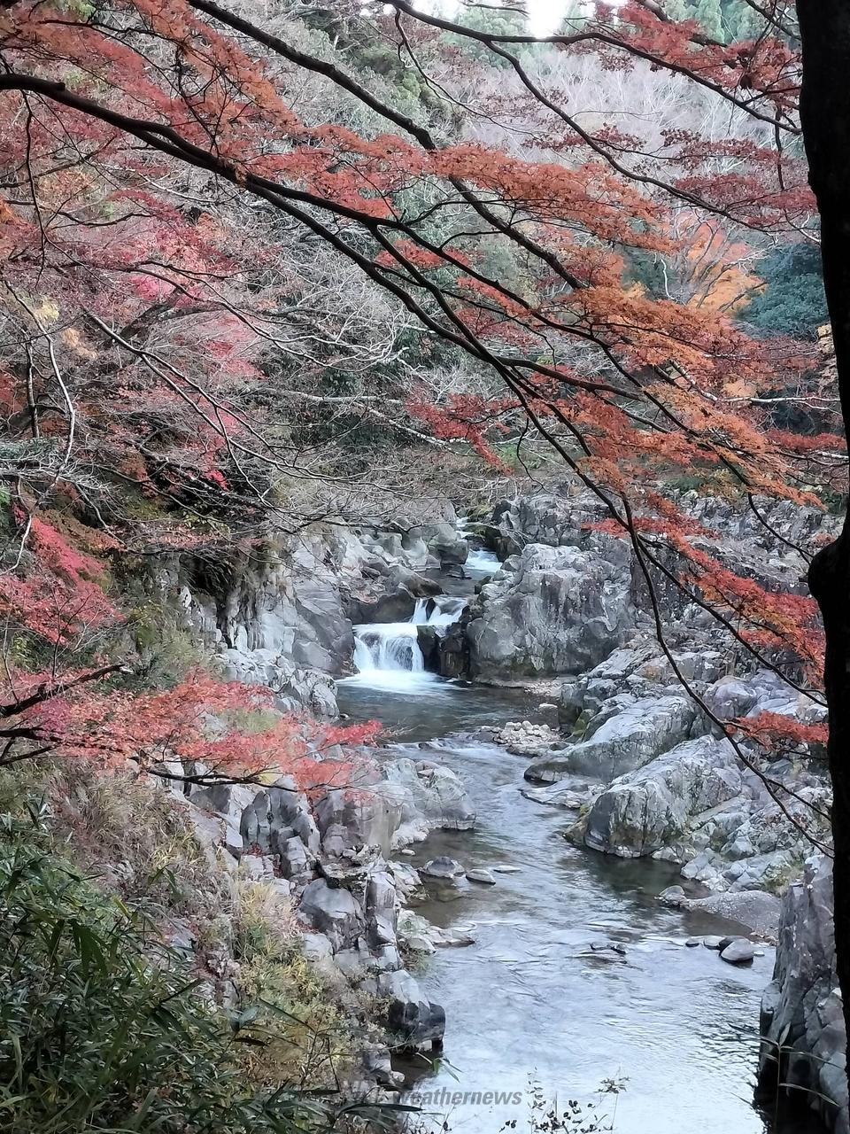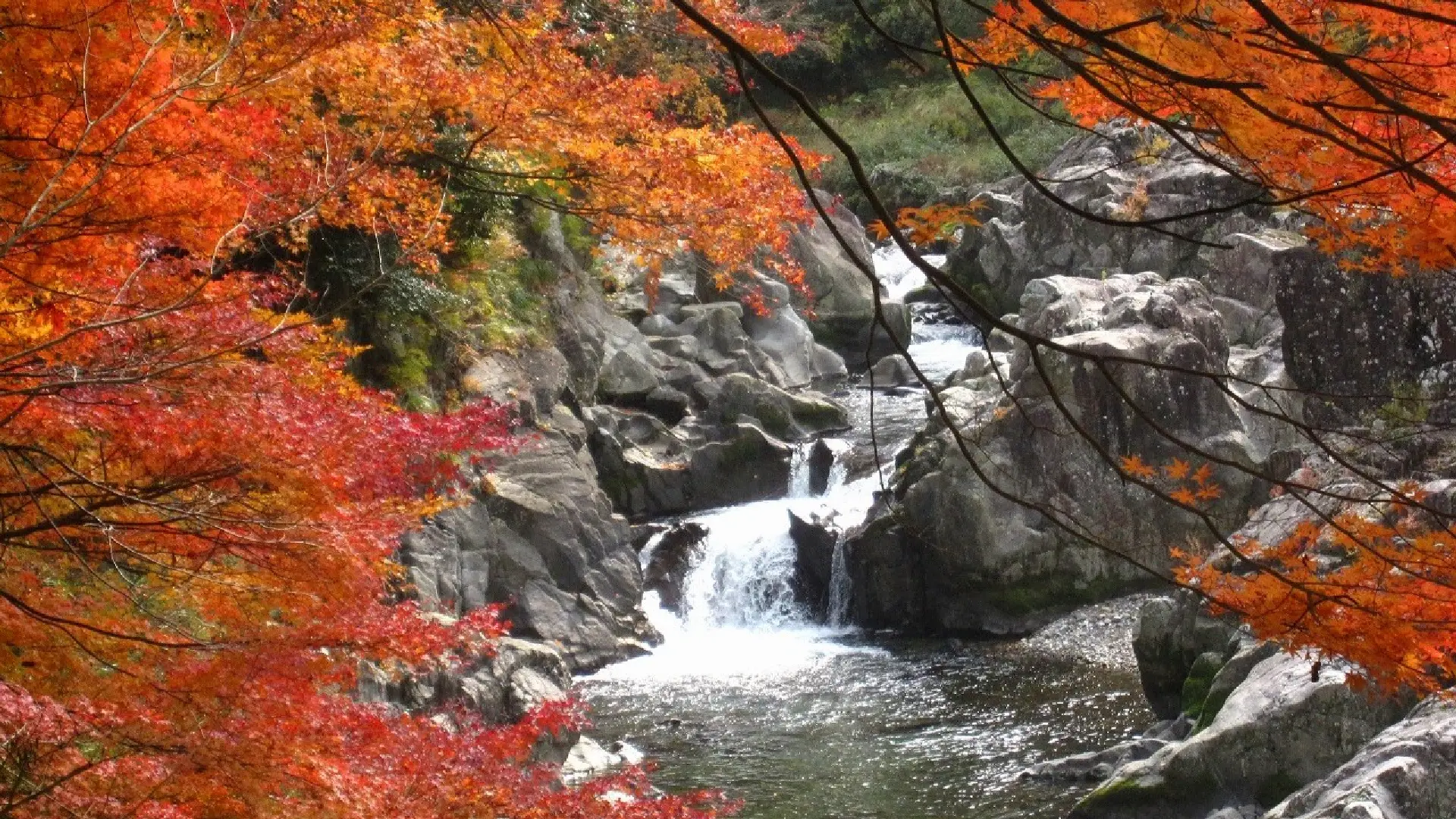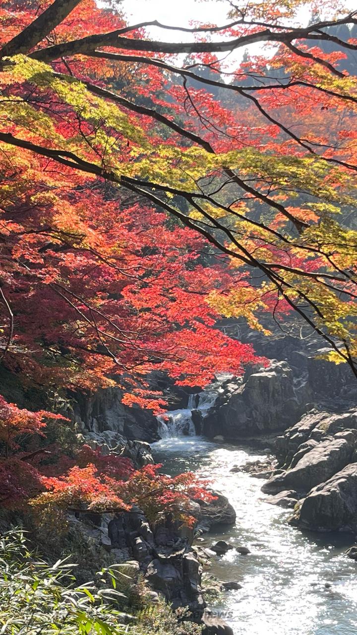 奇岩景勝の滝に枝を差し延べている紅葉は空気の清浄と冷気でその美しさは抜群です。遊歩道は格好の写真撮影場所です。