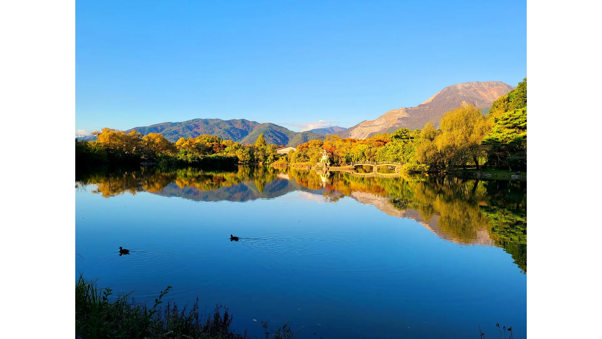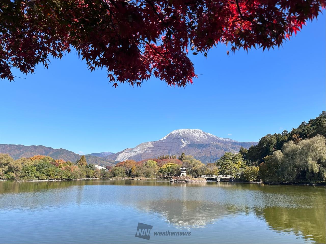 オシドリなどの野鳥が飛来する三島池では、穏やかな日には滋賀県最高峰の伊吹山が、水面に影をおとす通称「逆さ伊吹」を眺めることができ、紅葉との美しい調和を楽しむことができます。また、秋だけでなく、雪化粧した姿や桜の季節も美しい眺めを楽しめます。