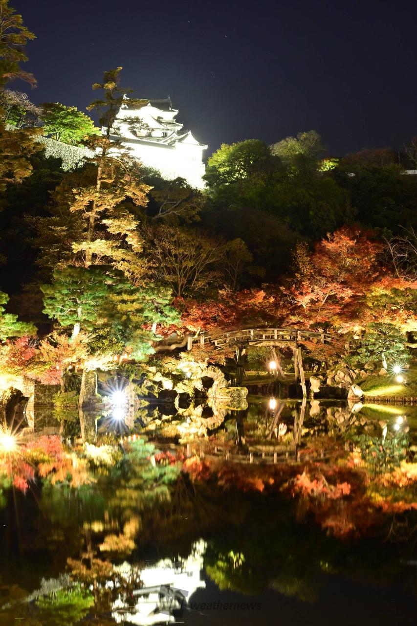 玄宮園から見上げた彦根城の天守、ライトアップ時では水面に映る紅葉