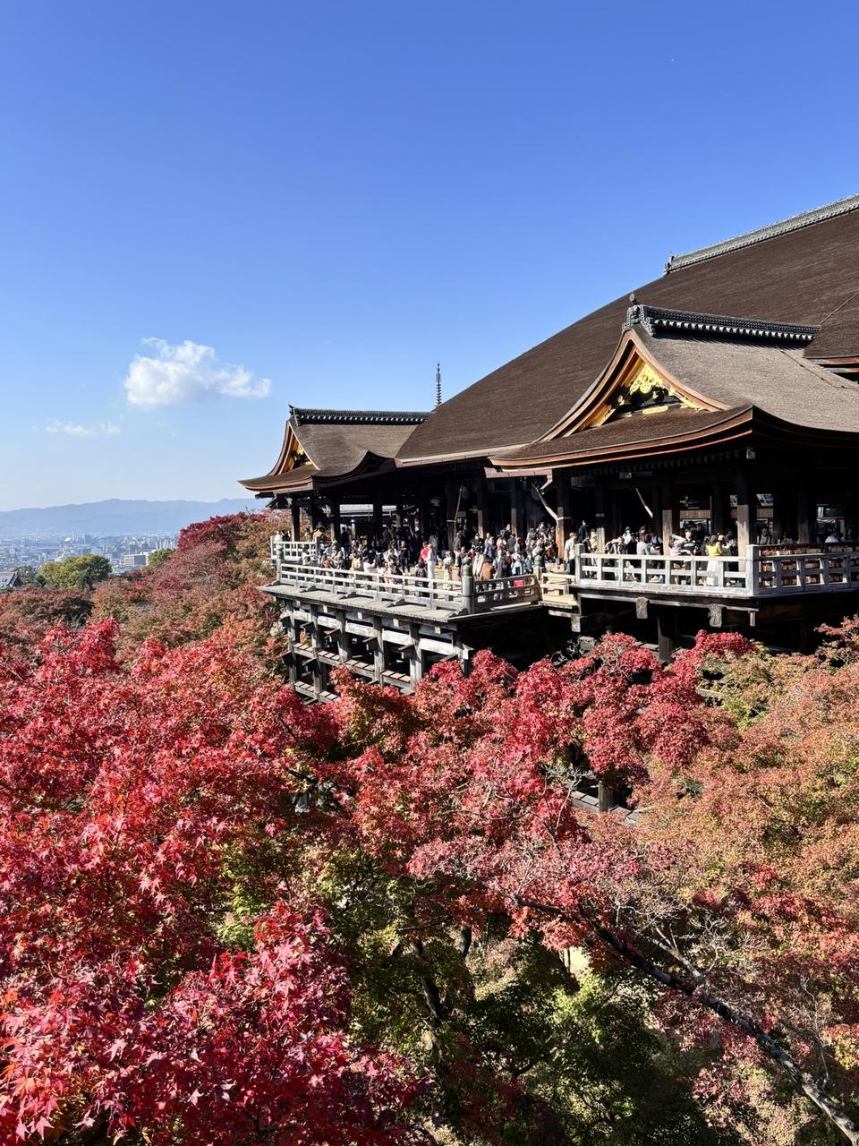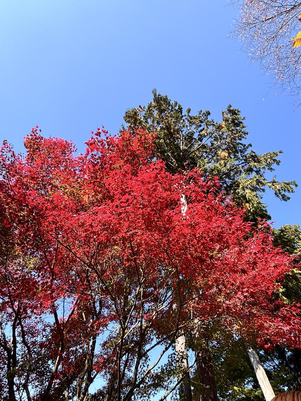 本堂を包み込むように生い茂るモミジなど、境内には1000本以上のモミジが真っ赤に染まります。