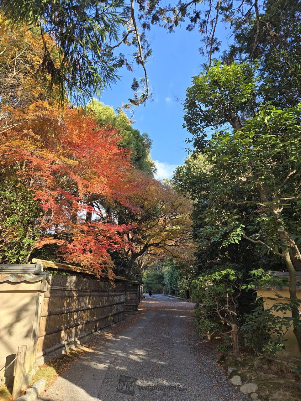 「石庭」土塀越しのサクラとモミジ。庫裡前の石段にあるモミジトンネル。