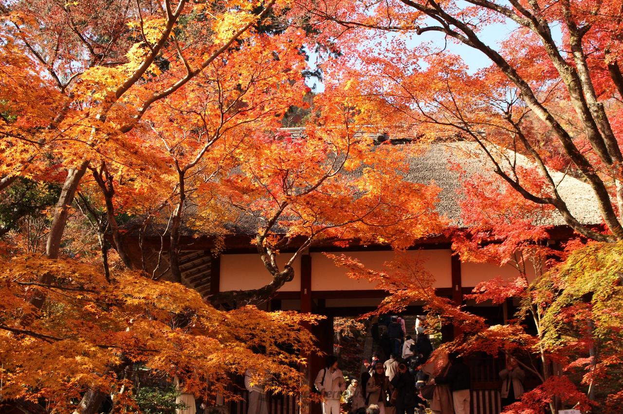 平安時代後期より紅葉の名所として名高い小倉山の山腹に位置する常寂光寺は約200本のモミジの古木が紅色、橙色、黄色に紅葉して苔の緑と相俟って美しい。