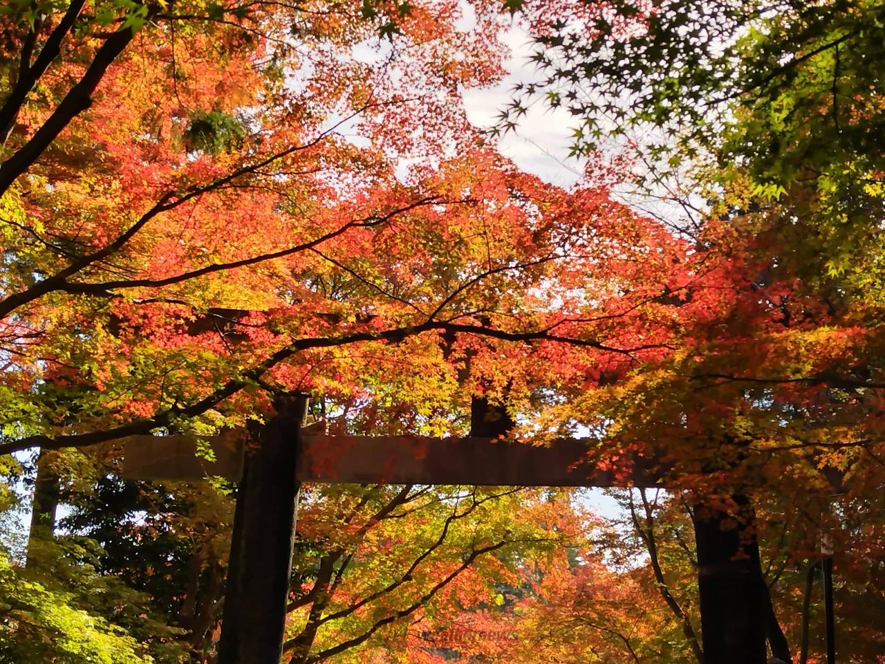 参道の紅葉のトンネル、参道を染める紅葉の絨毯、鯉沢の池に浮かぶ紅葉。