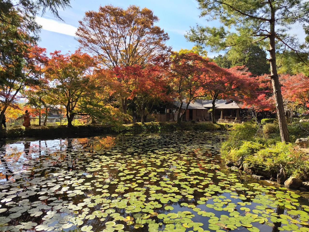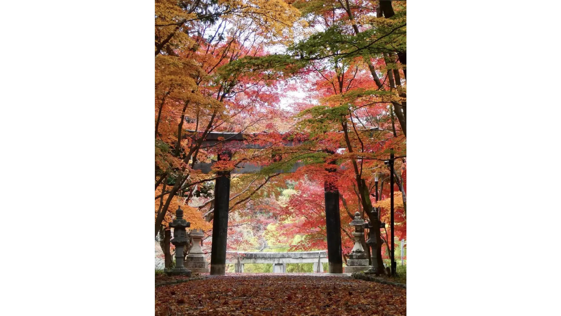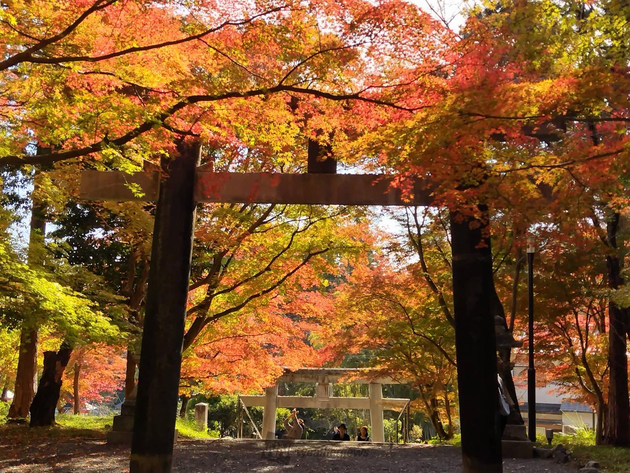 参道の紅葉のトンネル、参道を染める紅葉の絨毯、鯉沢の池に浮かぶ紅葉。