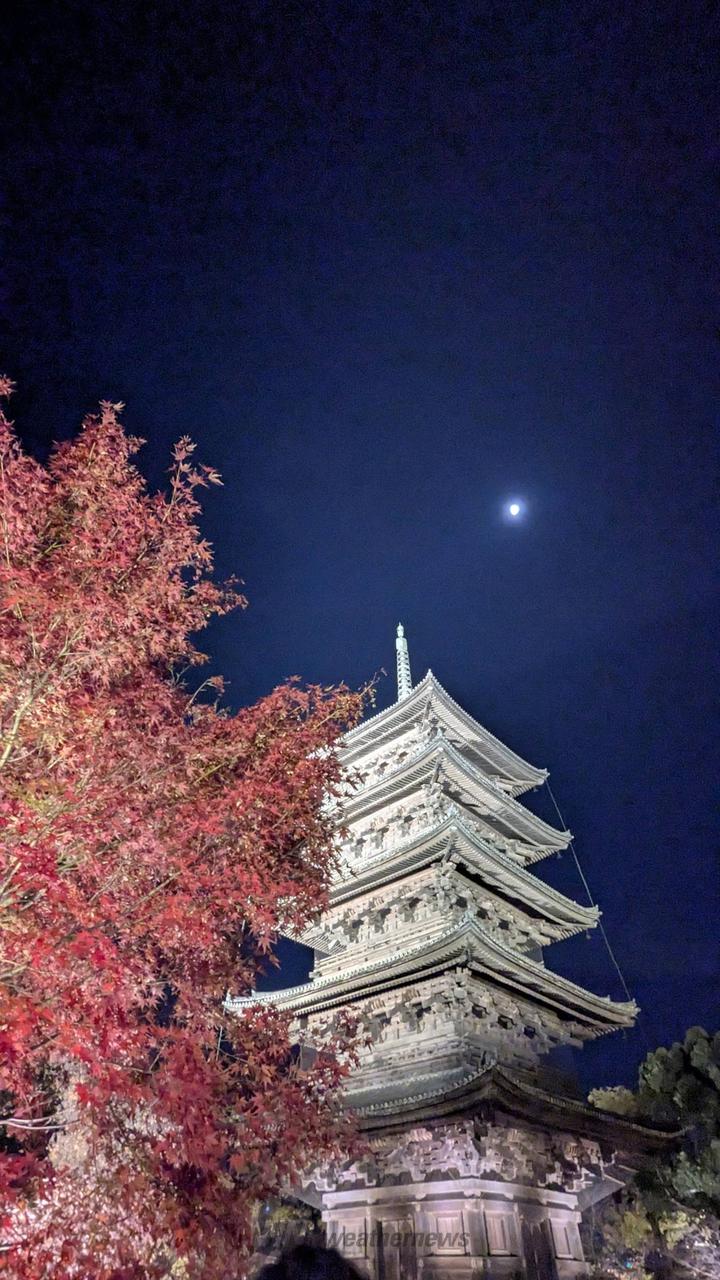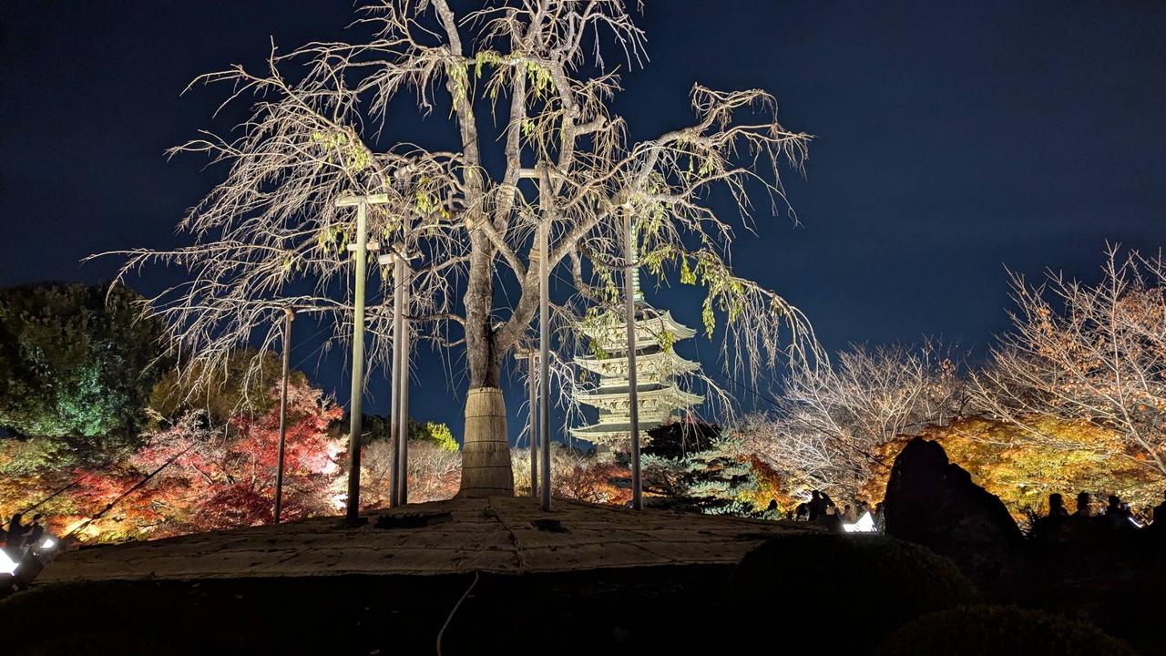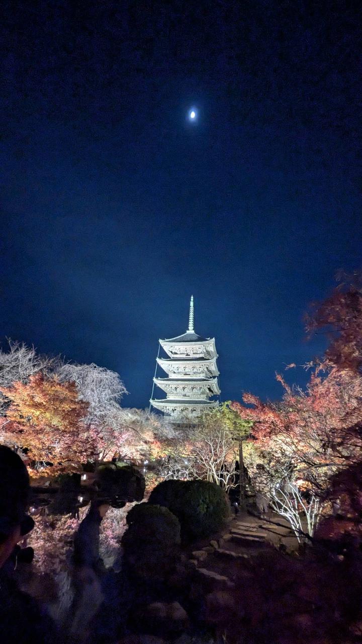五重塔を背景に色とりどりの紅葉樹が境内を染めます。2025年11月1日~12月14日はライトアップ開催18:00~21:30(受付21:00まで)。