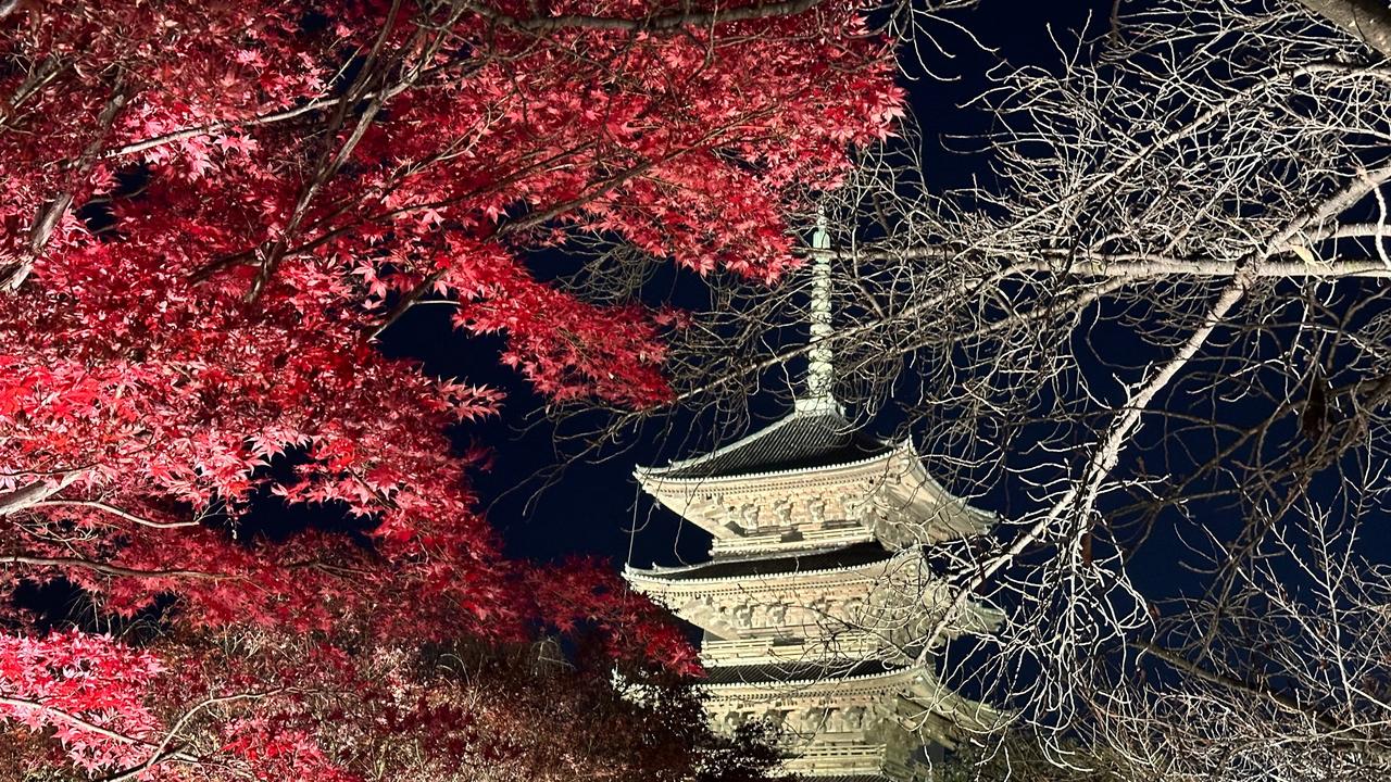 五重塔を背景に色とりどりの紅葉樹が境内を染めます。2025年11月1日~12月14日はライトアップ開催18:00~21:30(受付21:00まで)。