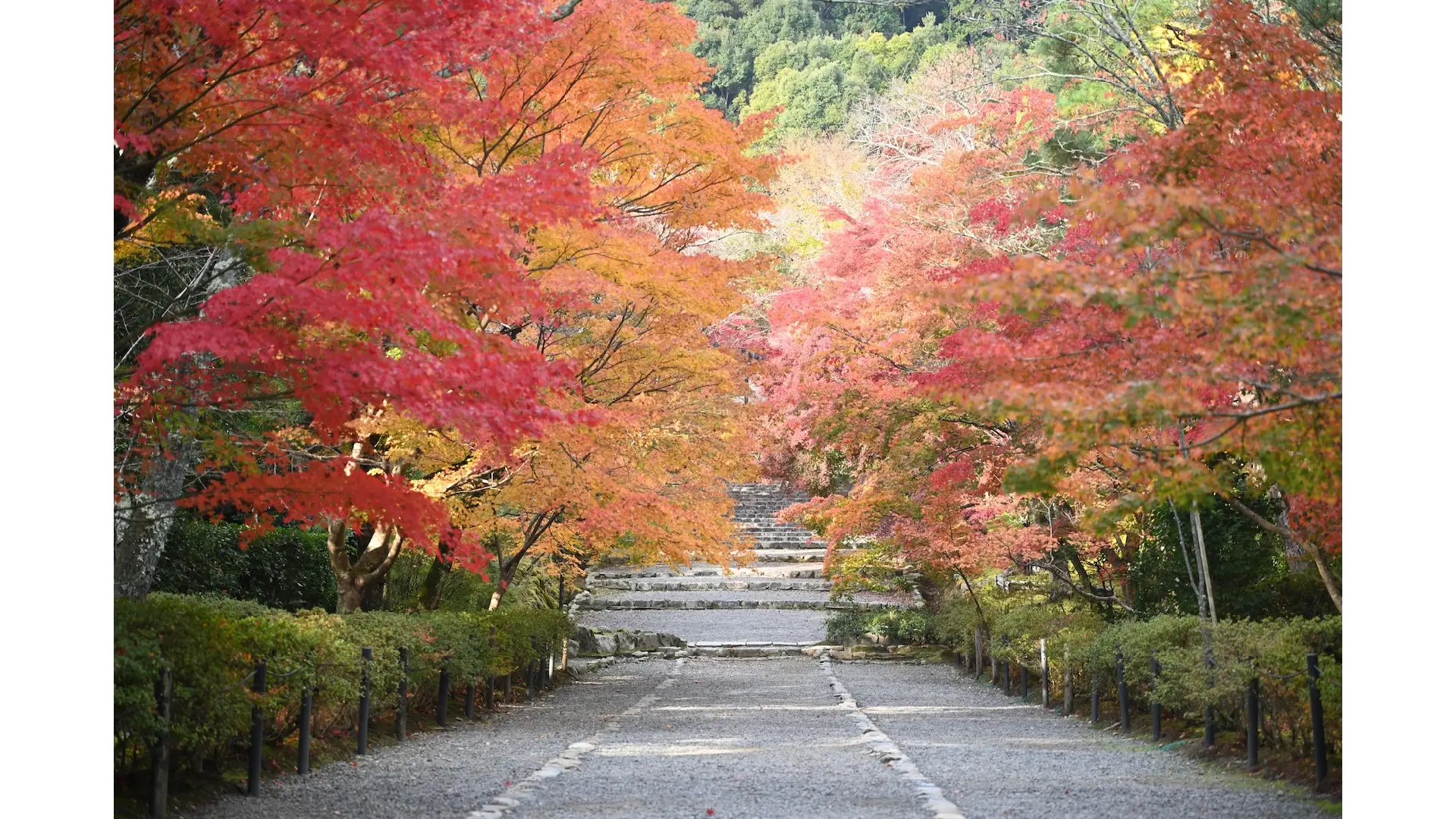 山門を入り、眼前に広がる「紅葉の馬場」という山道、勅使門の紅葉、小倉山のグラデーションの紅葉は圧巻