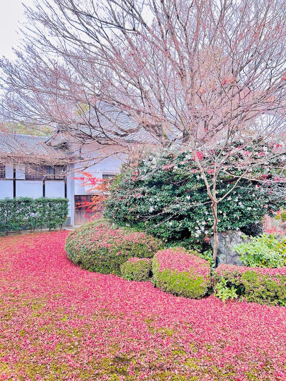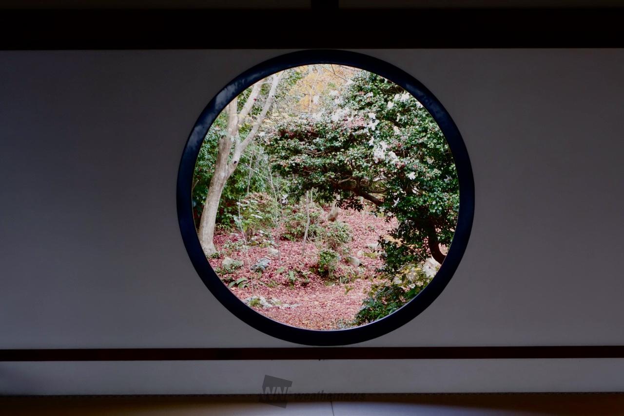 円窓(悟りの窓)、角窓(迷いの窓)から眺める紅葉。書院から眺める鶴亀庭園の紅葉。