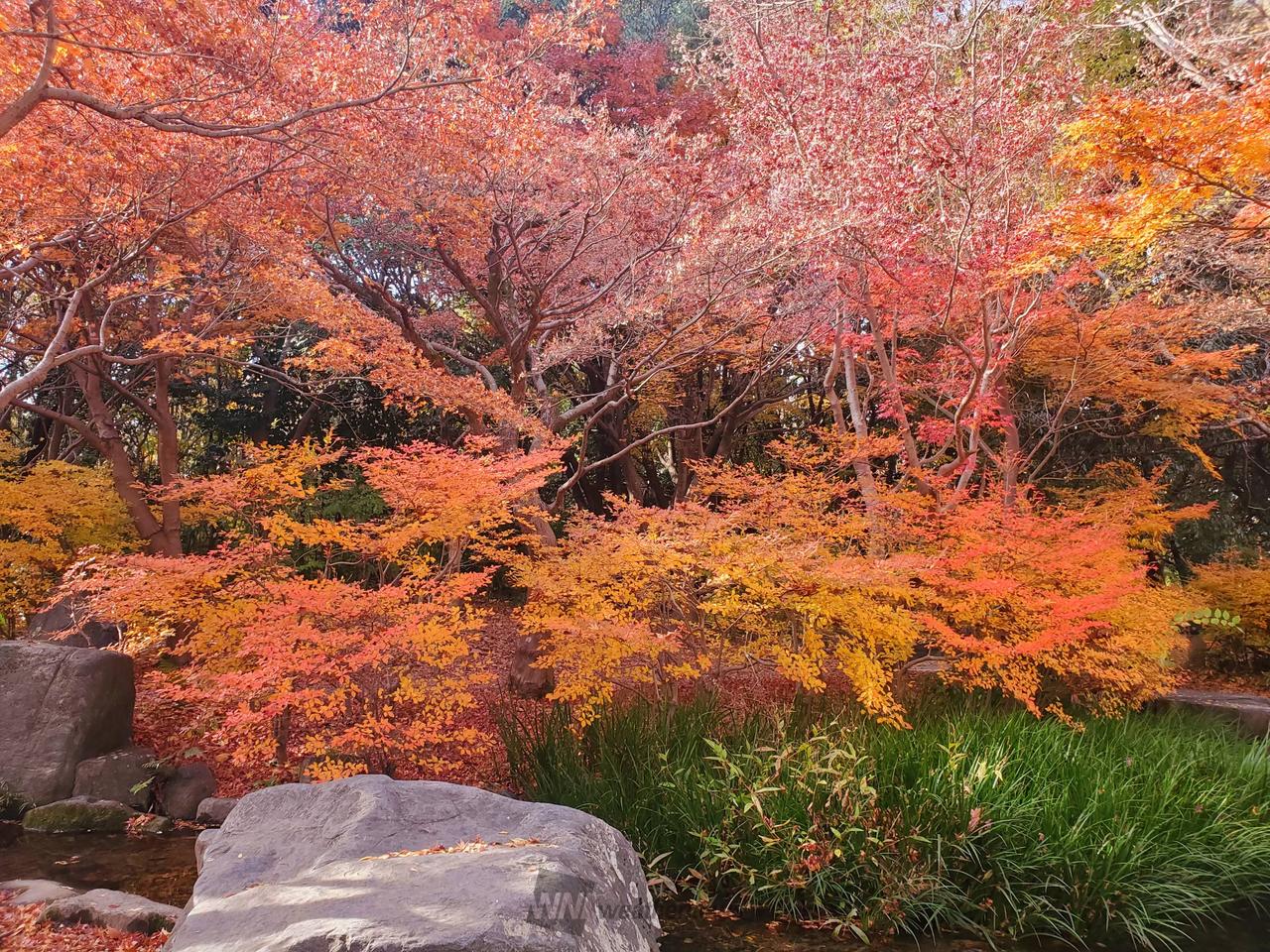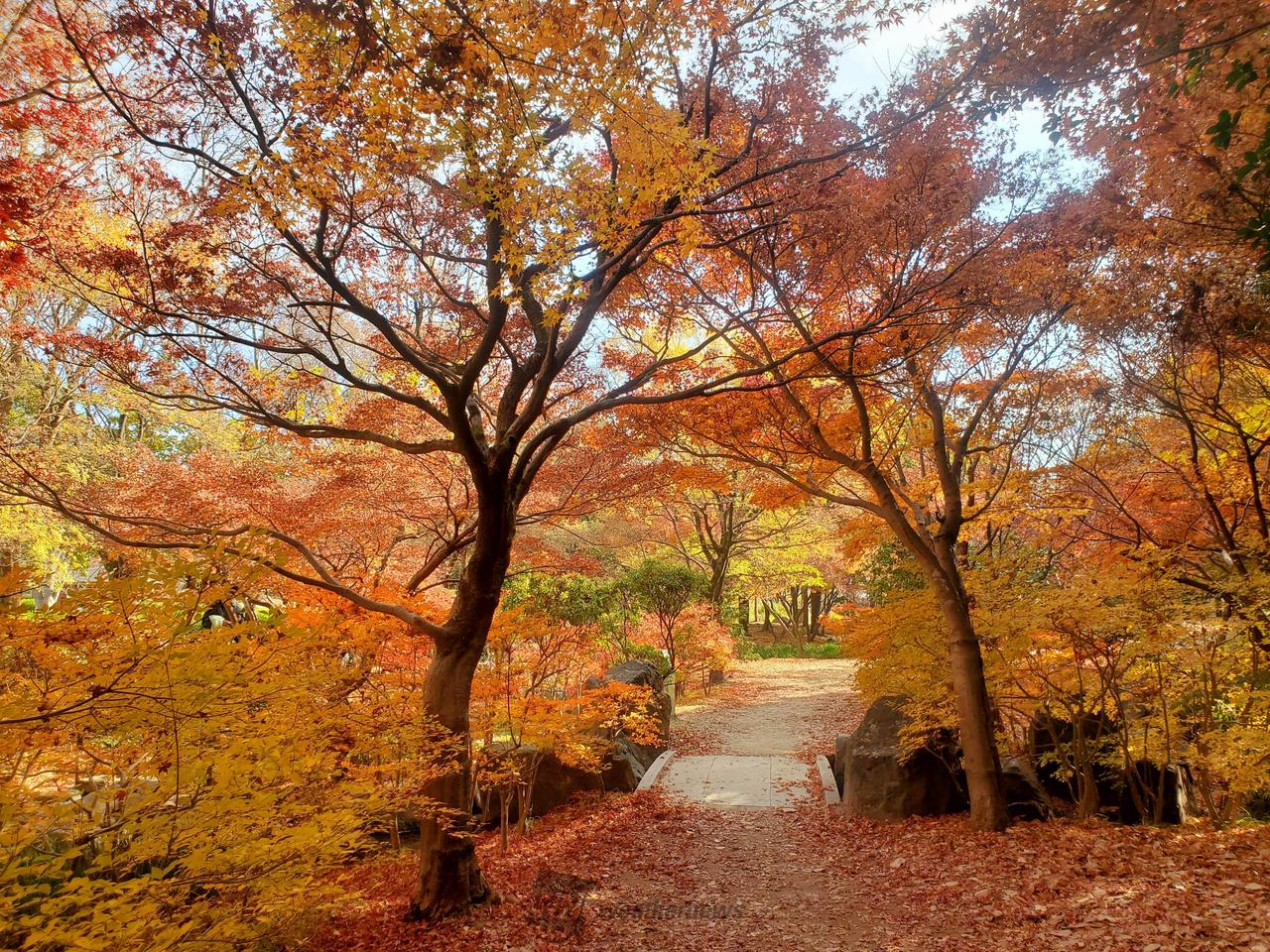 晩秋の「朱雀の庭」は、約100本のモミジなどが紅や黄に色づきます。夜間にライトアップされ、池に映り込む紅葉の景色は幻想的で、市街地には珍しい絶好の紅葉狩りスポットです。