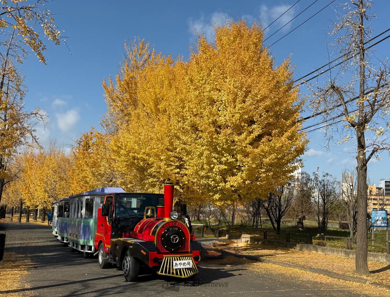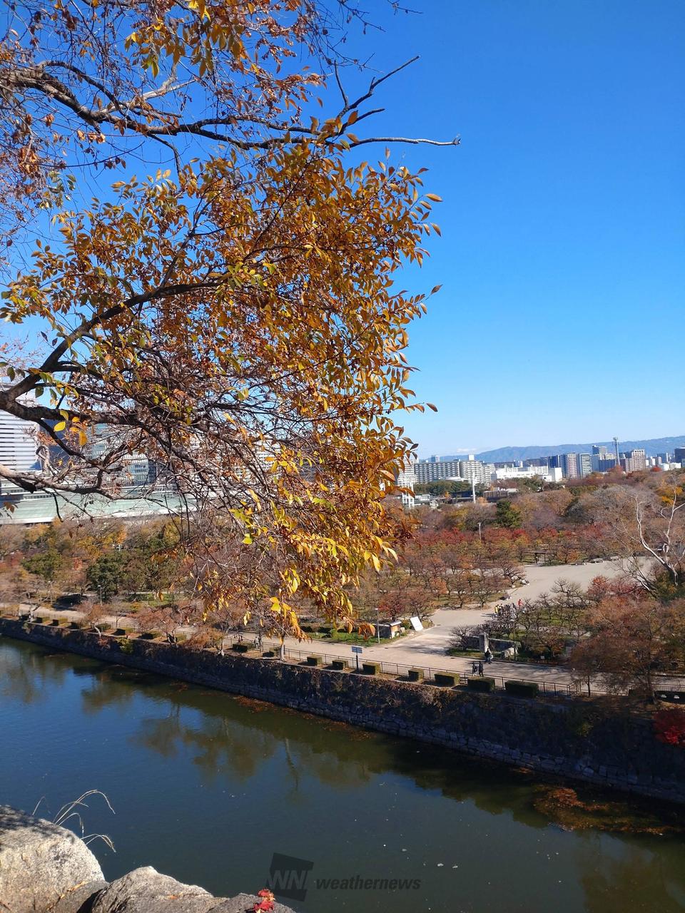 大阪城公園東側の約1kmに渡るイチョウ並木、天守閣前の推定樹齢300年の大銀杏の黄金の枝垂れ、桜紅葉の西の丸庭園(有料)から望む大阪城が見所です。