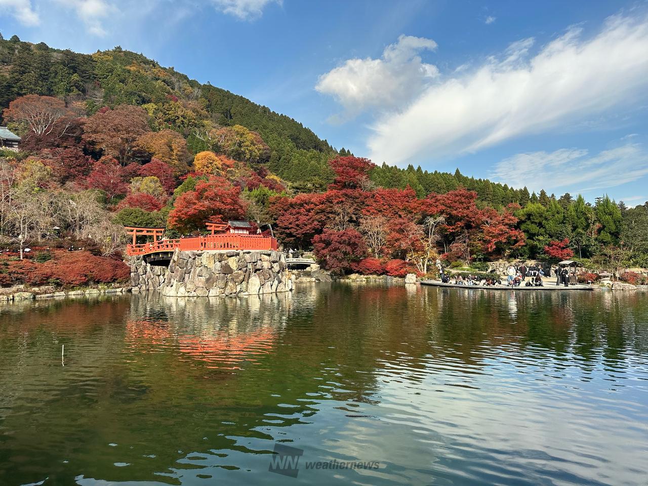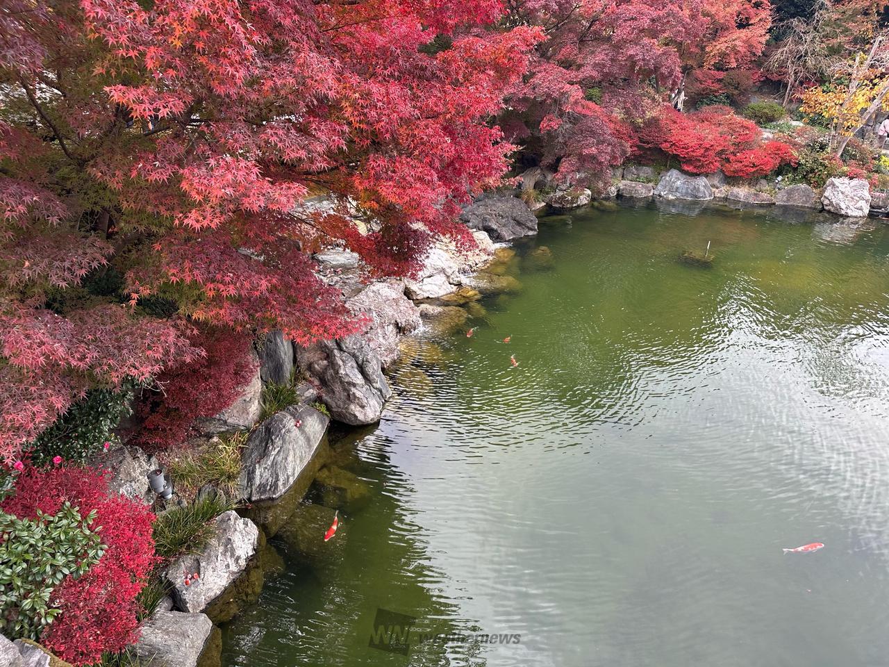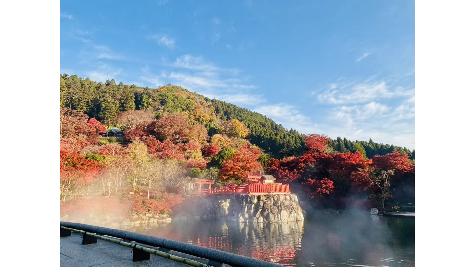 山門から多宝塔にかけての紅葉のアーチ、弁天池から本堂を見上げる山の景色
