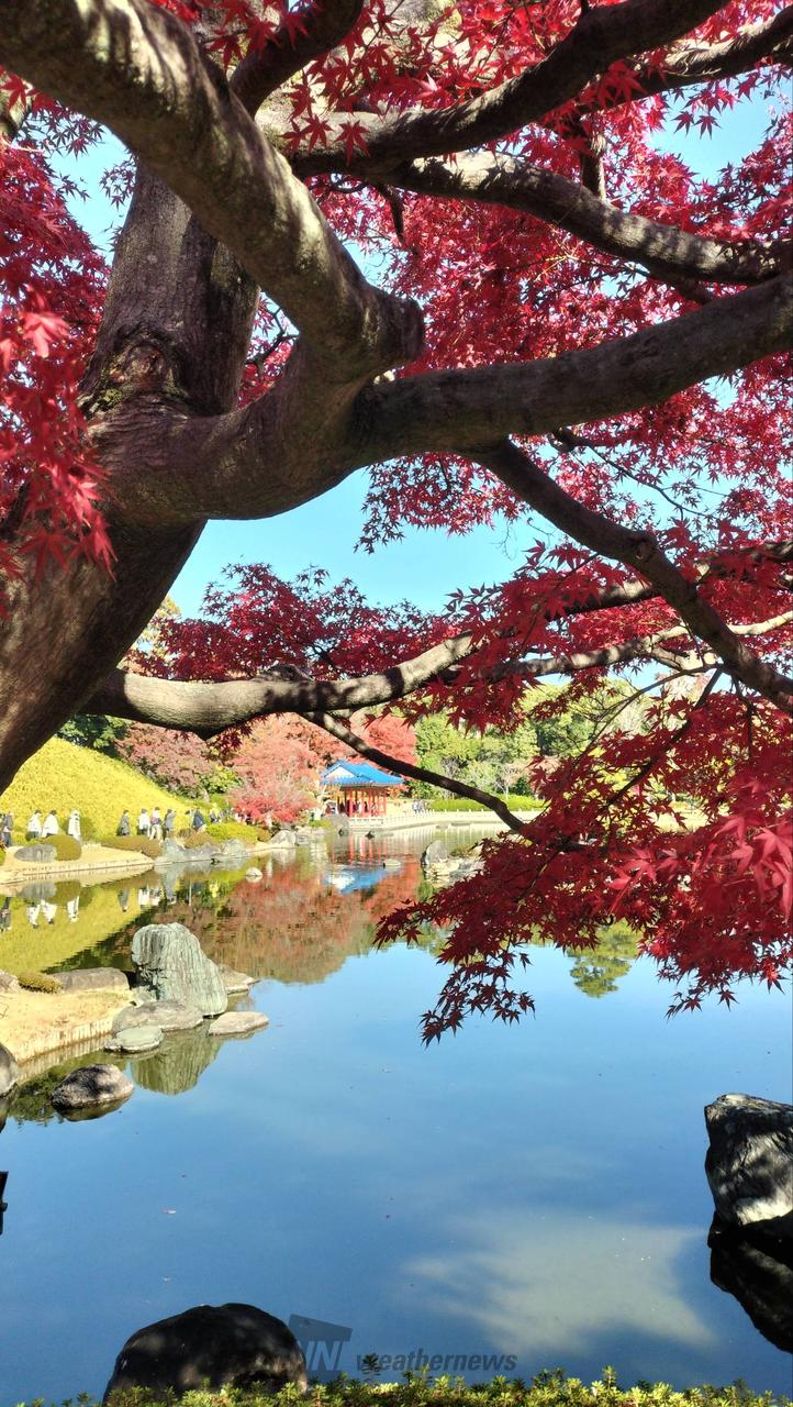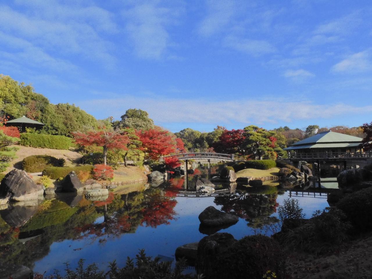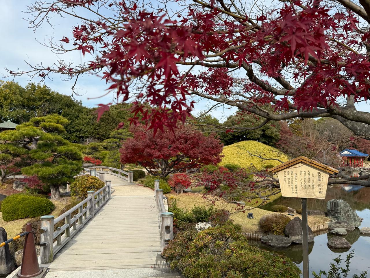 約100本のもみじが紅く色づきます。見所は映波橋、印月橋付近と石津渓上流あたりです。紅葉の最盛期にライトアップした大仙公園日本庭園秋季夜間特別開園を行います。