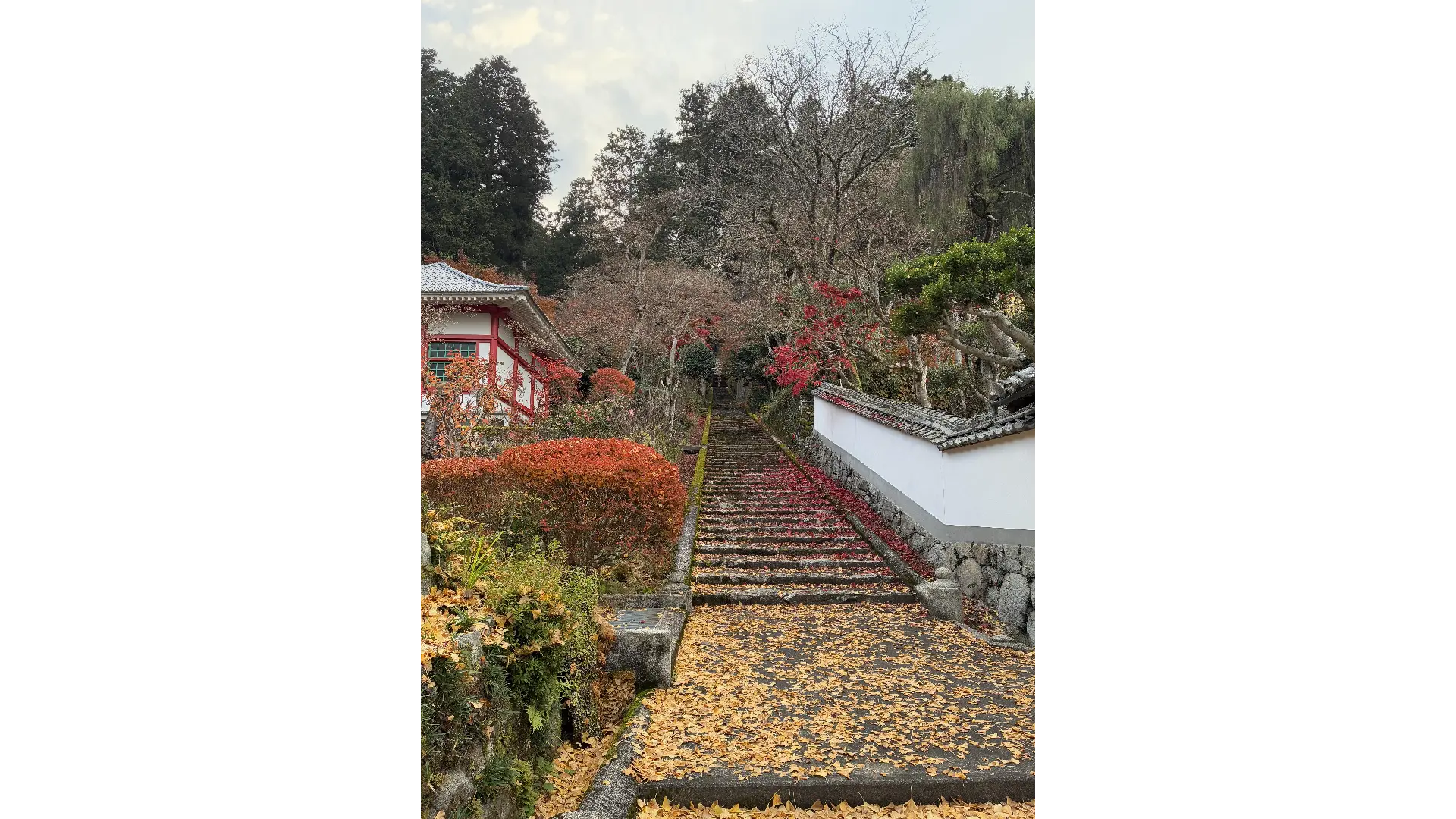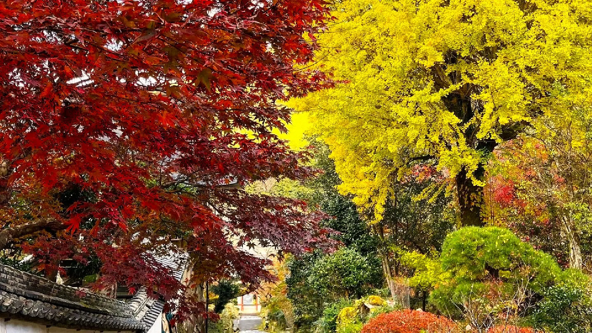 境内にはイロハモミジやオオモミジなど大小約300本が紅葉します。また、高さ20m、幹回り3mの大イチョウ(推定樹齢180年)も鮮やかな黄色に色づきます。県内屈指の古刹・常勝寺は、春には「桜の寺」として知られていますが、秋も紅葉の穴場スポットです。関西一円からのリピーターが多いのが特徴です。モミジの葉が落ちると真っ赤に、イチョウが落葉すると黄色に参道の石段が染まります。