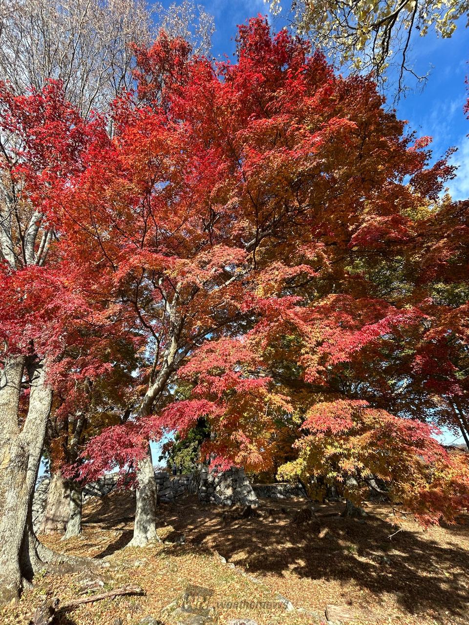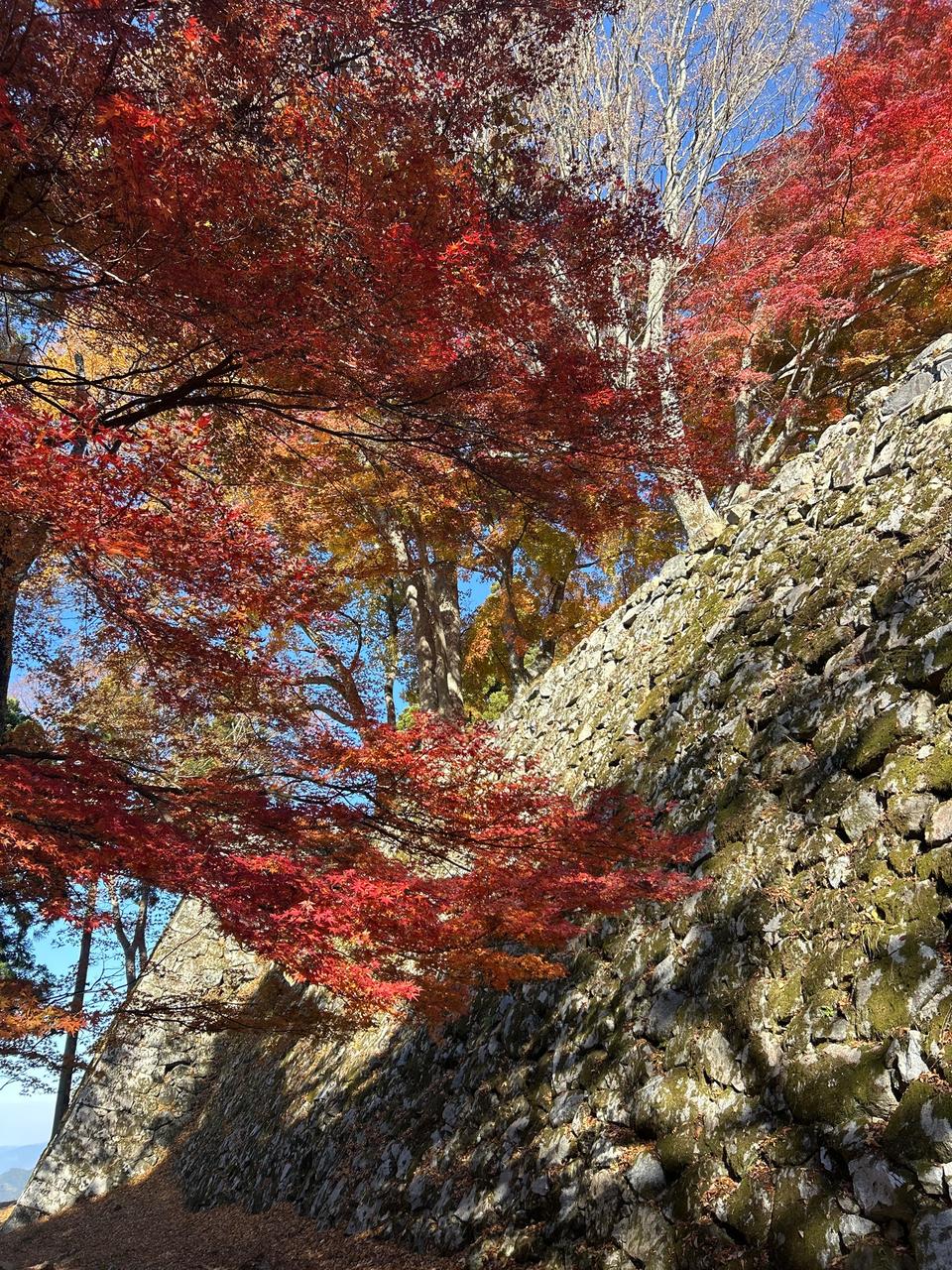 急な山道を登りきり、見上げると、そこには苔むした石垣と真っ赤に色づいた紅葉があらわれます。このコントラストは、山歩きの疲れを吹き飛ばしてくれるほど美しく、見る者を感動させます。本丸・二の丸跡周辺が見所です。ライブカメラを配信中。「高取城ライブカメラ」で検索を。
