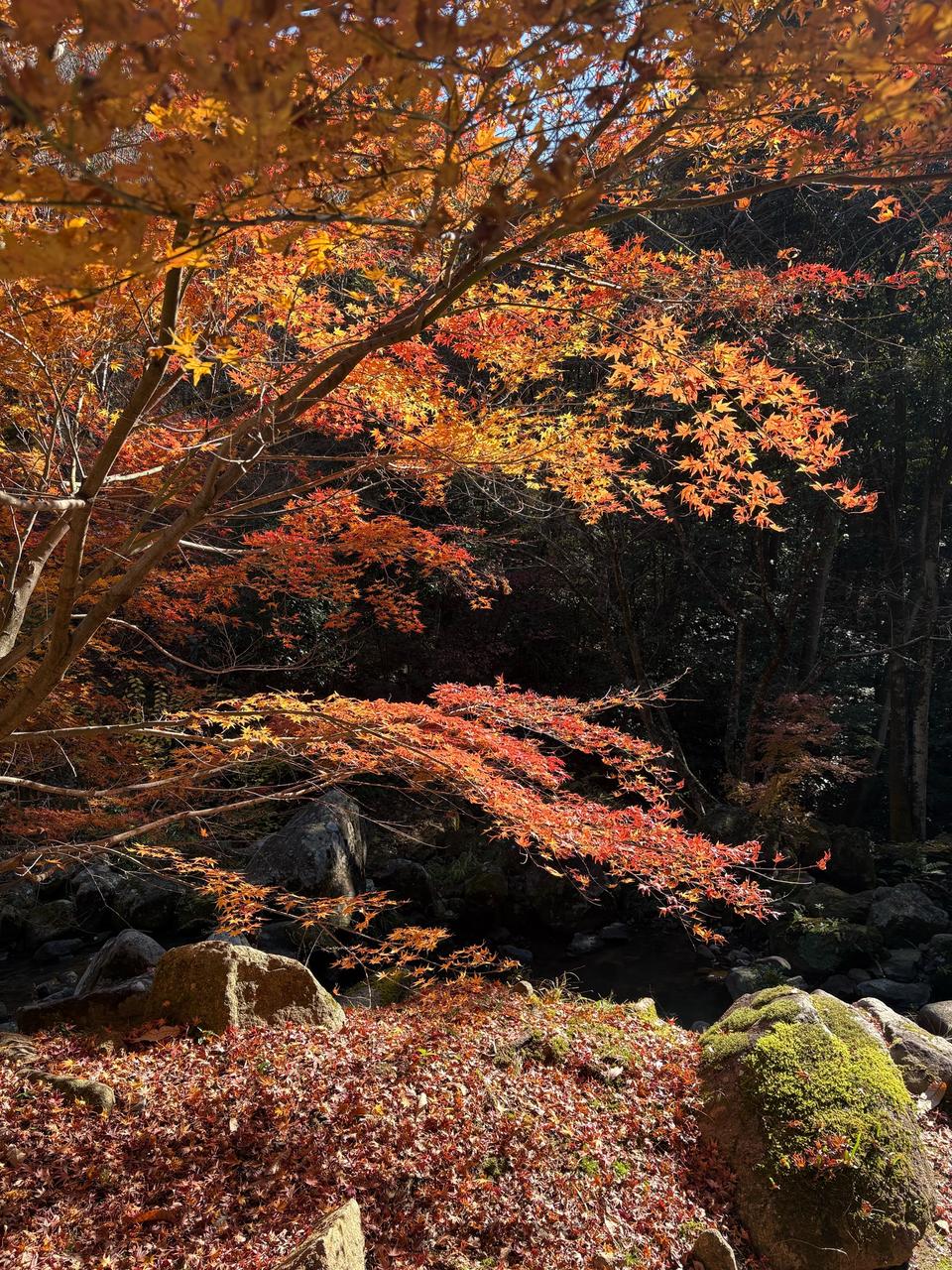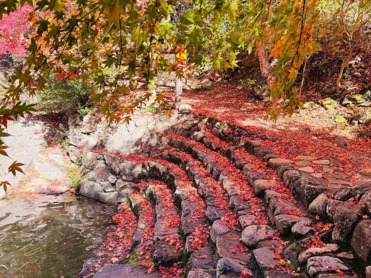 夏には天然のすべり滝として有名な三郎の滝は、秋になると紅葉の名所に様変わり。駐車場から遊歩道を上がっていくと3つの滝があり、その周囲に約800本のモミジが鮮やかに色づきます。