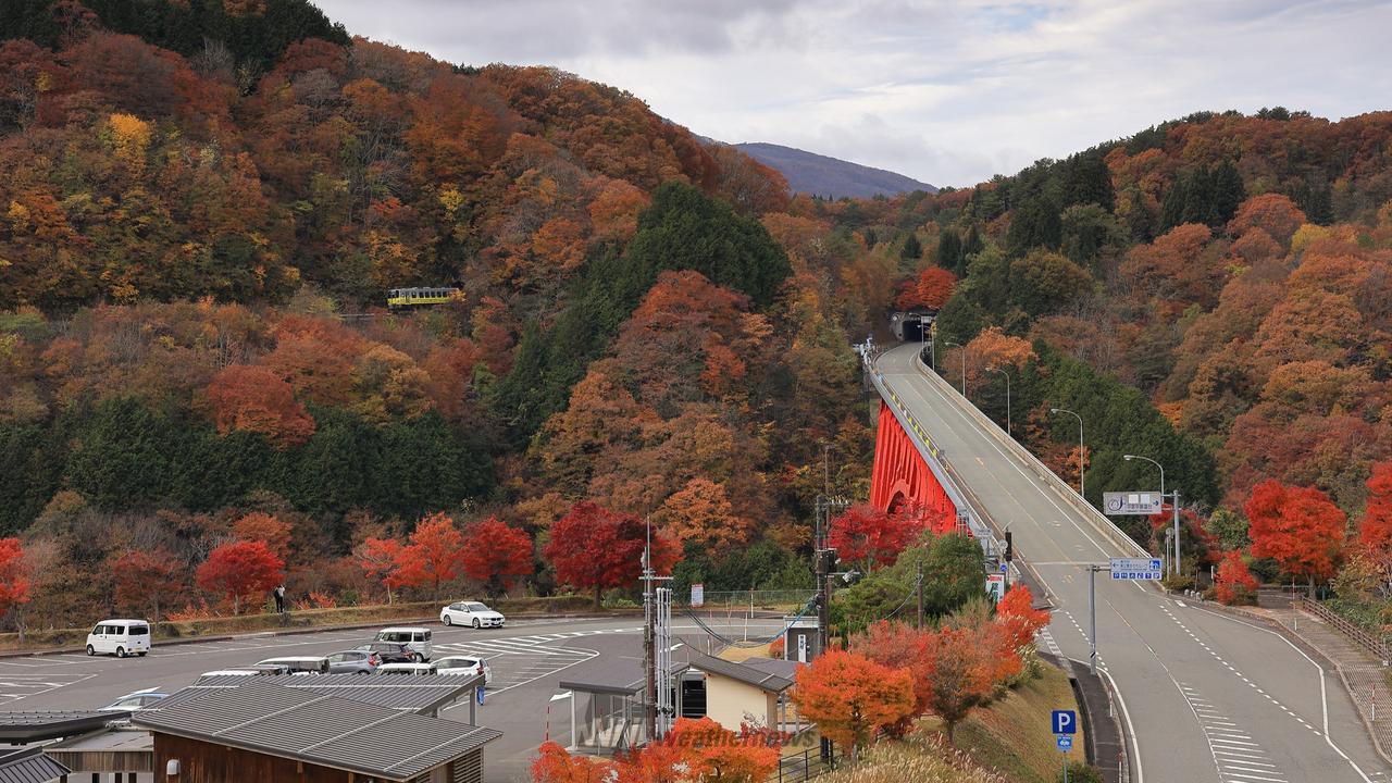 日本最大級の二重ループ道路「奥出雲おろちループ」の周辺には真っ赤に染まる紅葉樹がたくさんあり、360度紅葉に包まれる。JR木次線を眺める道の駅展望台からは列車とのコラボもおすすめ!標高約700mの絶景をお楽しみください。