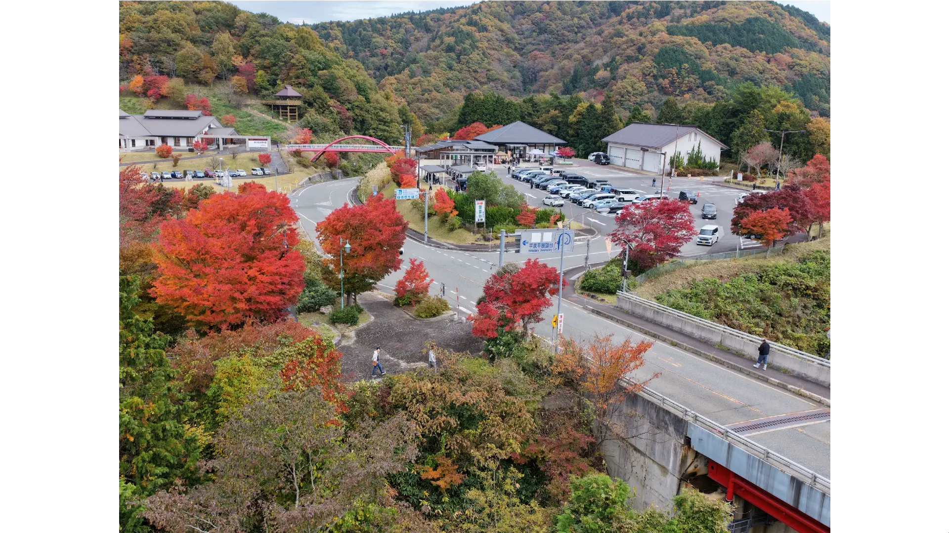 日本最大級の二重ループ道路「奥出雲おろちループ」の周辺には真っ赤に染まる紅葉樹がたくさんあり、360度紅葉に包まれる。JR木次線を眺める道の駅展望台からは列車とのコラボもおすすめ!標高約700mの絶景をお楽しみください。