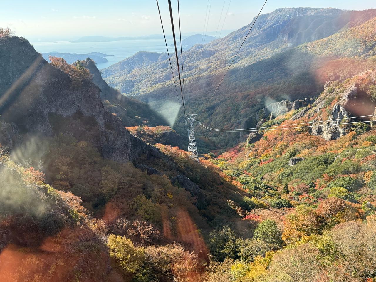ロープウェイの車窓から渓谷、海または山にむけて