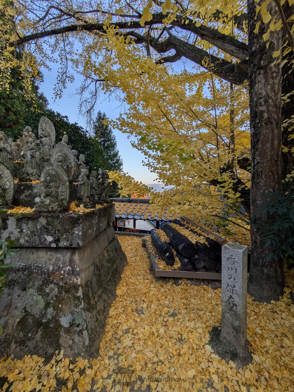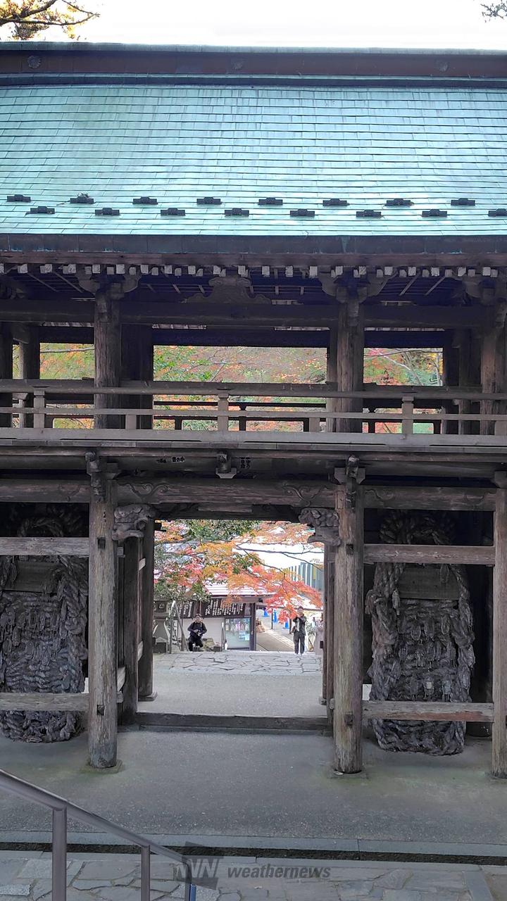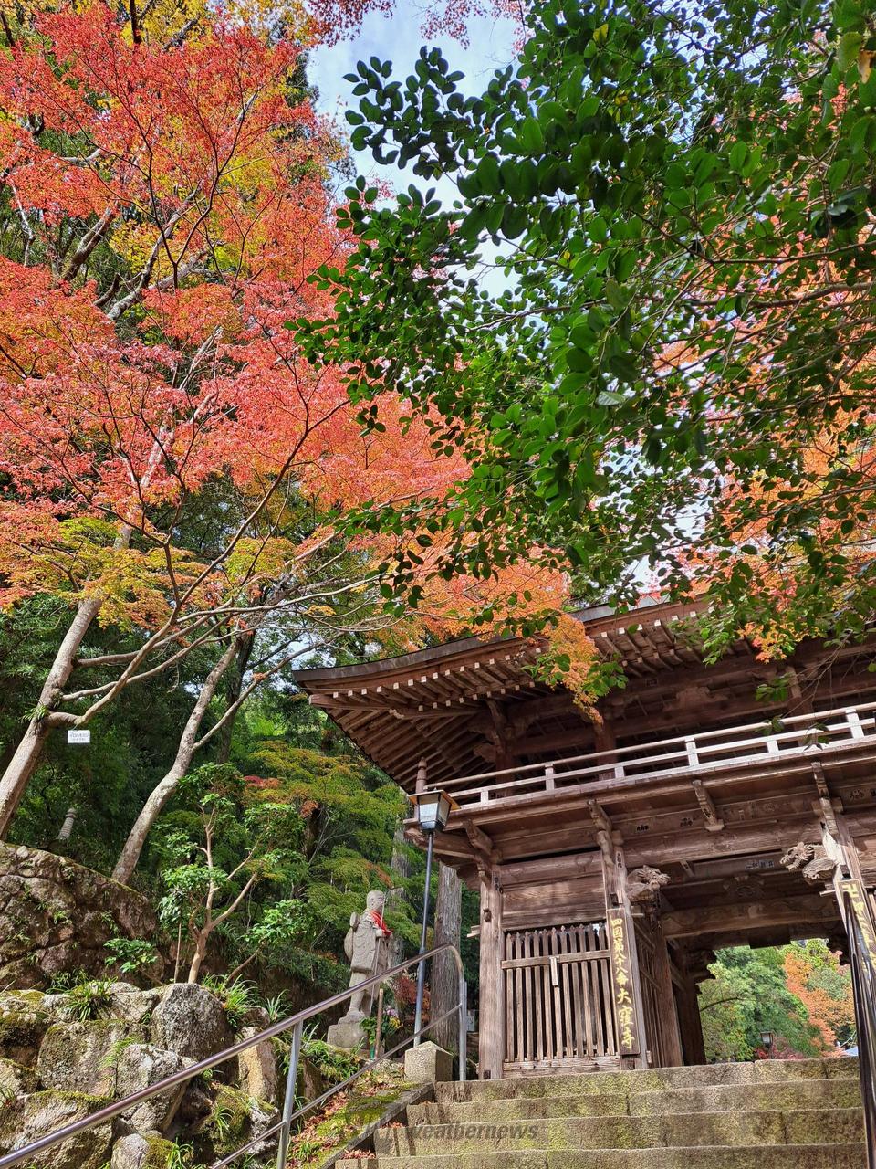 奇岩に覆われた標高約770mの胎蔵ヶ峰を借景にたたずむ四国霊場八十八ヶ所結願の寺です。山々に抱かれた寺の周辺は季節によってさまざまな顔を見せますが、モミジやカエデ、イチョウの大木が色づく秋の景観はまさに息をのむほどの美しさです。お遍路さんに交じって紅葉狩りを楽しむ観光客も大勢訪れます。見頃は11月中旬ごろになりそうです。