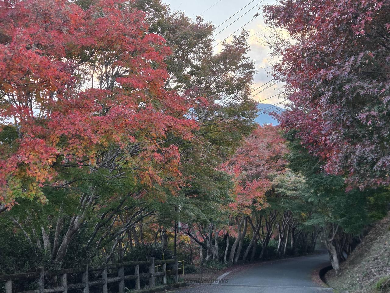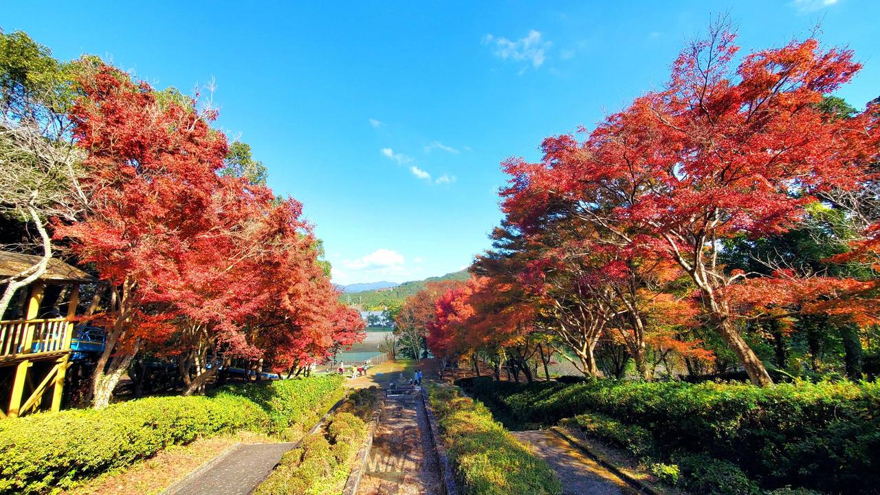 モミジ並木がトンネルのようになっており、葉が色づくと非常に美しい景観を作り出します。なお、公園内道路上にあり、車や歩行者が多く通行しますので、安全に配慮し楽しんでいただきますようお願いします。