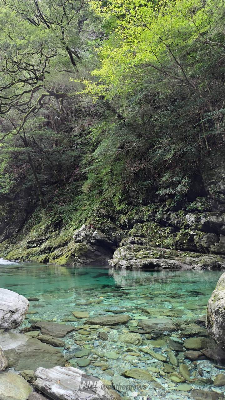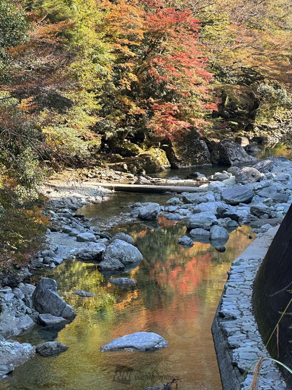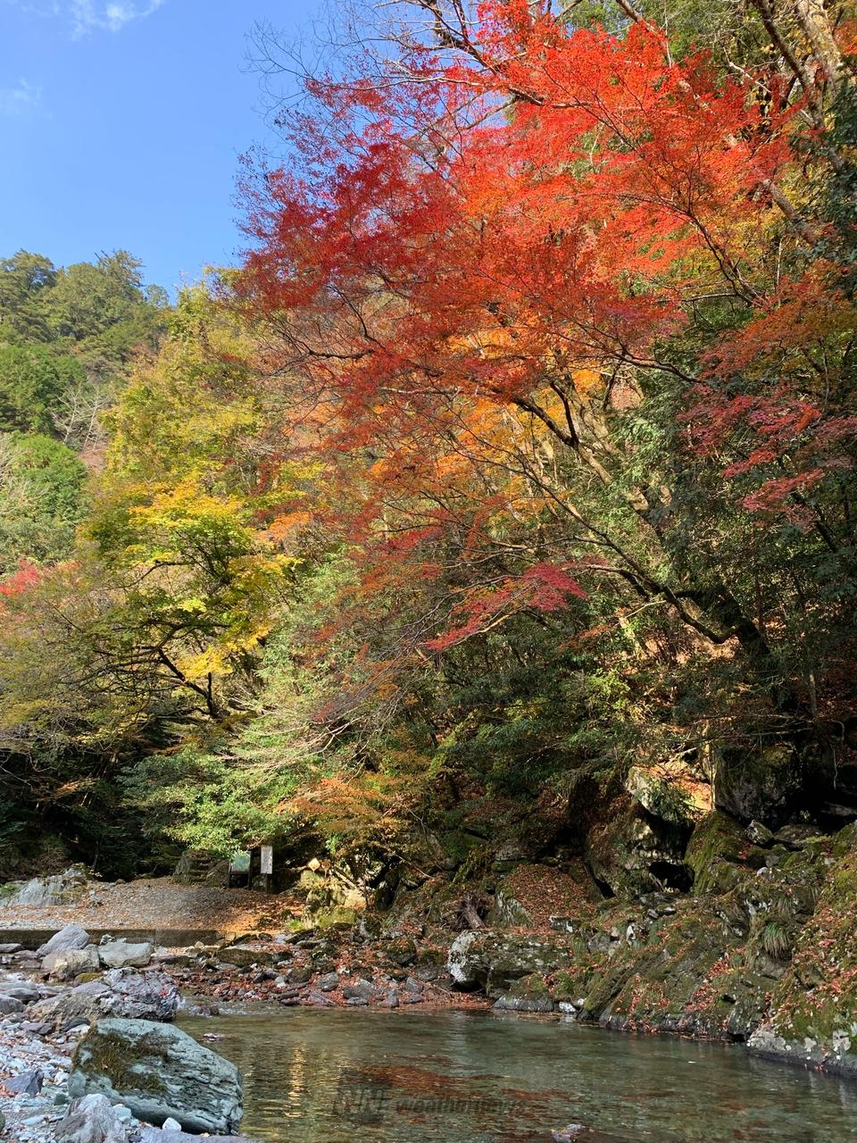 標高1859mの筒上山の南斜面に広がる県立自然公園安居渓谷。高さ約30mの岸壁がそそり立つ千仞峡(せんじんきょう)やもみじ谷、見返りの滝と見所が多いです。乙女川原から遊歩道を10分ほど歩くとしぶきが光って美しい飛龍の滝があります。青白い岩の上の澄みきった流れに、鮮やかな紅葉が映り込み、この季節の景観は必見です。