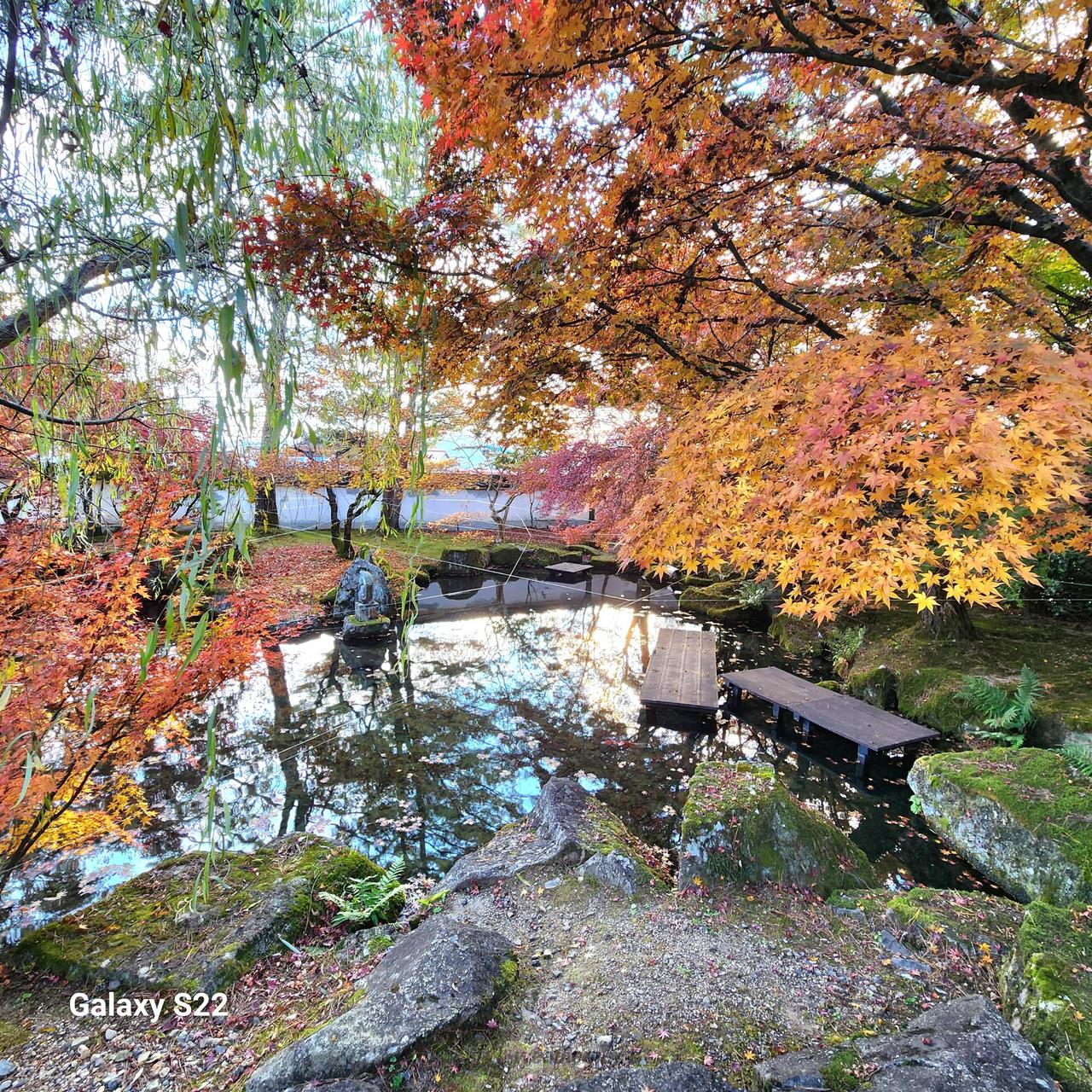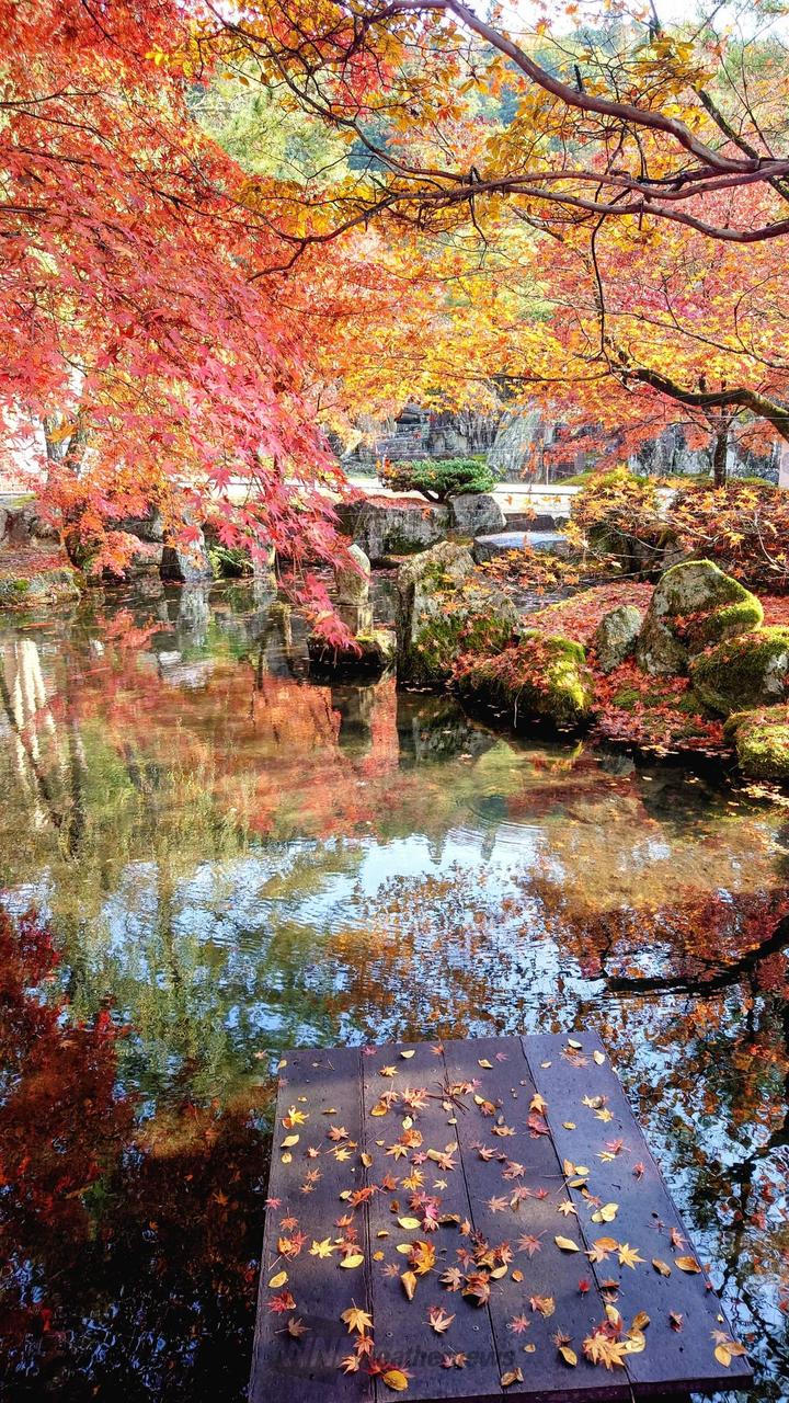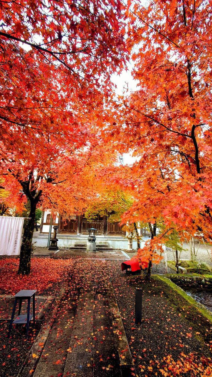 本堂の東側から回廊へ向けて撮ると、紅葉が美しく撮れます。