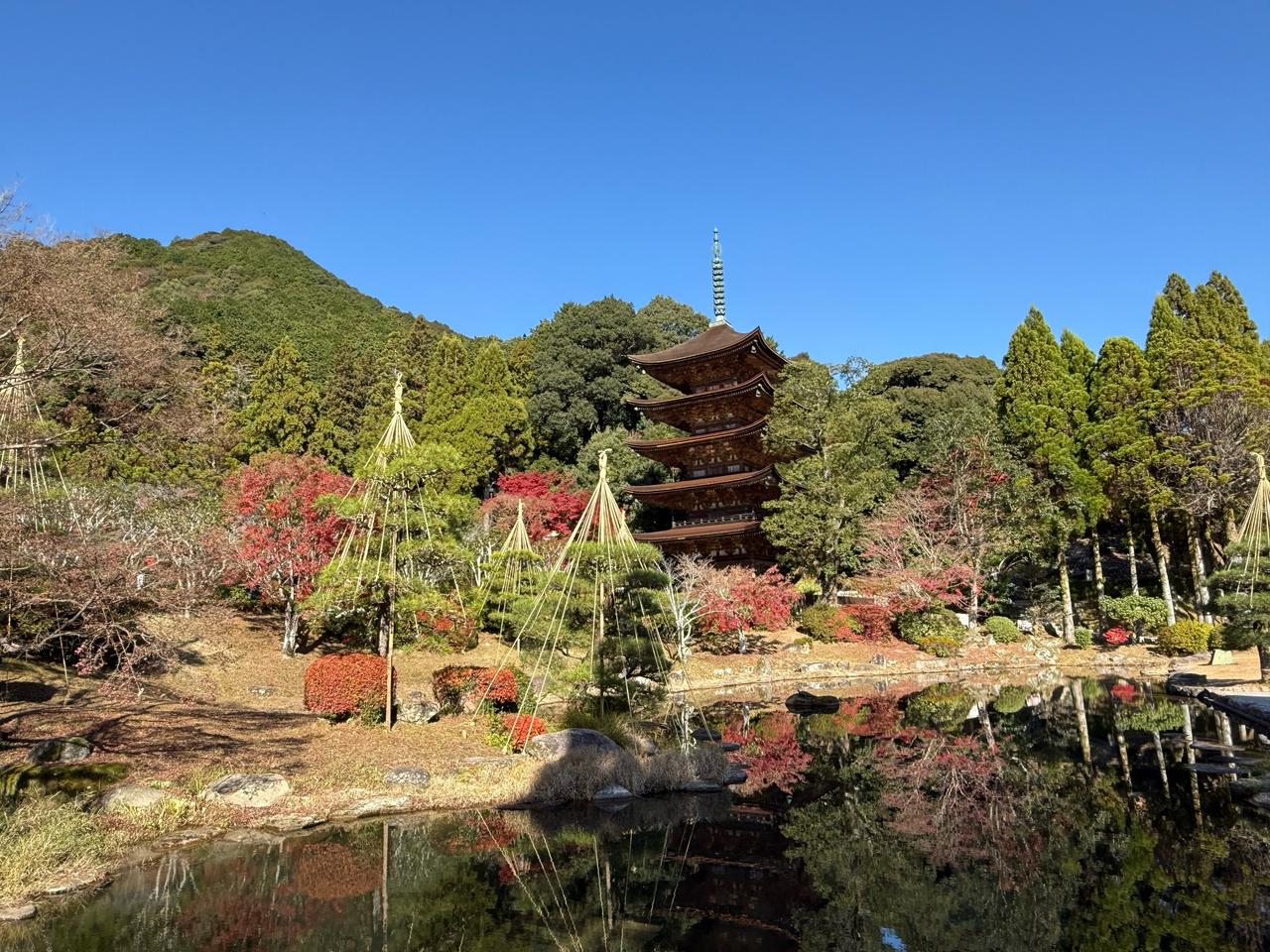 瑠璃光寺五重塔周辺の木々が紅く秋色に染まる様子は大変美しく、池にその姿が映る姿は圧巻です。春は桜、夏は新緑、秋は紅葉、冬は雪景色と四季折々で違った表情を見ることができるため、他の季節に訪問するのもオススメです。