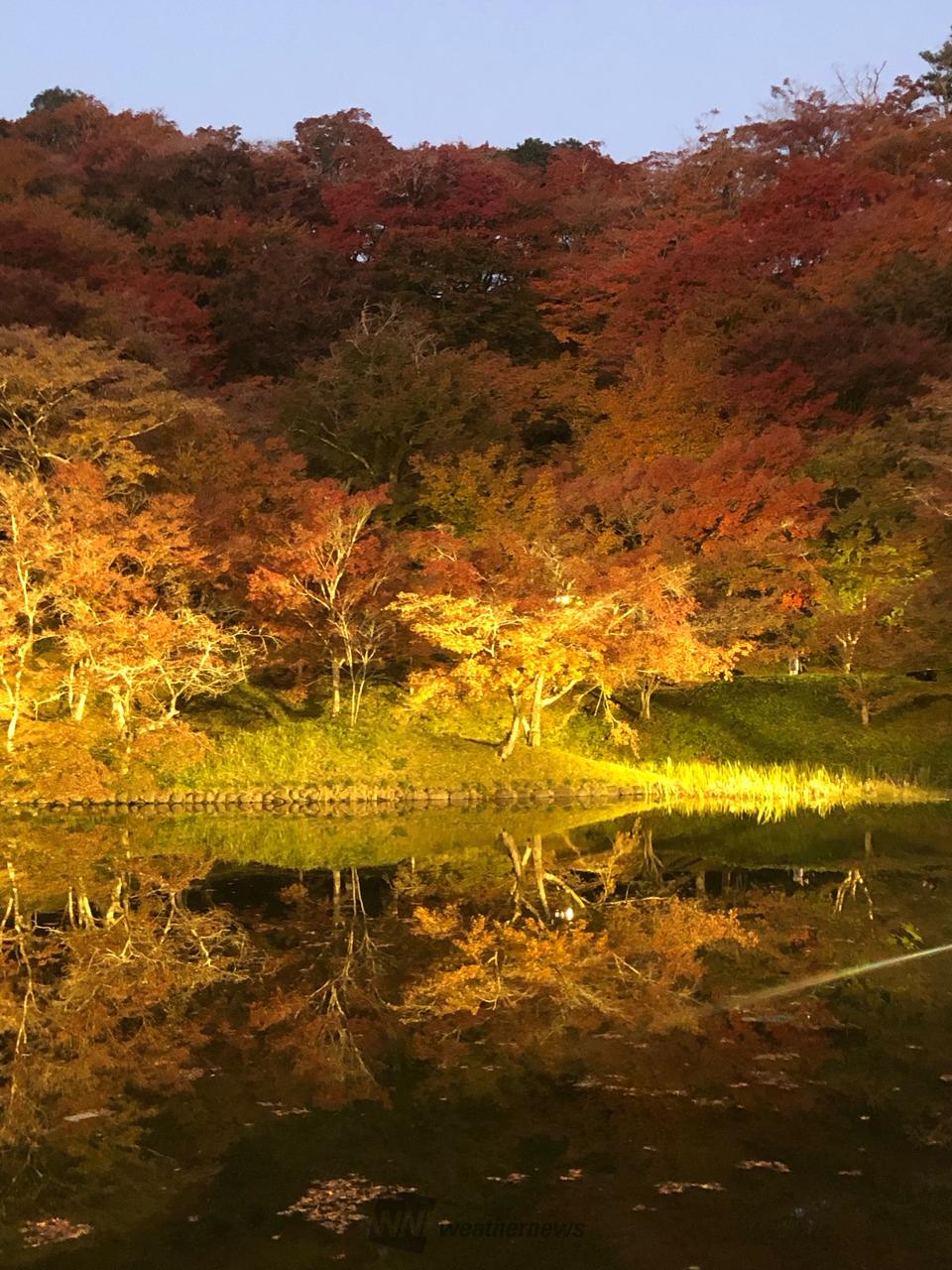 11月の週末に公園のライトアップを行います。昼と夜それぞれの紅葉を楽しむことができます。2025年11月15日(土)には水上夜神楽「水鏡」が行われます。