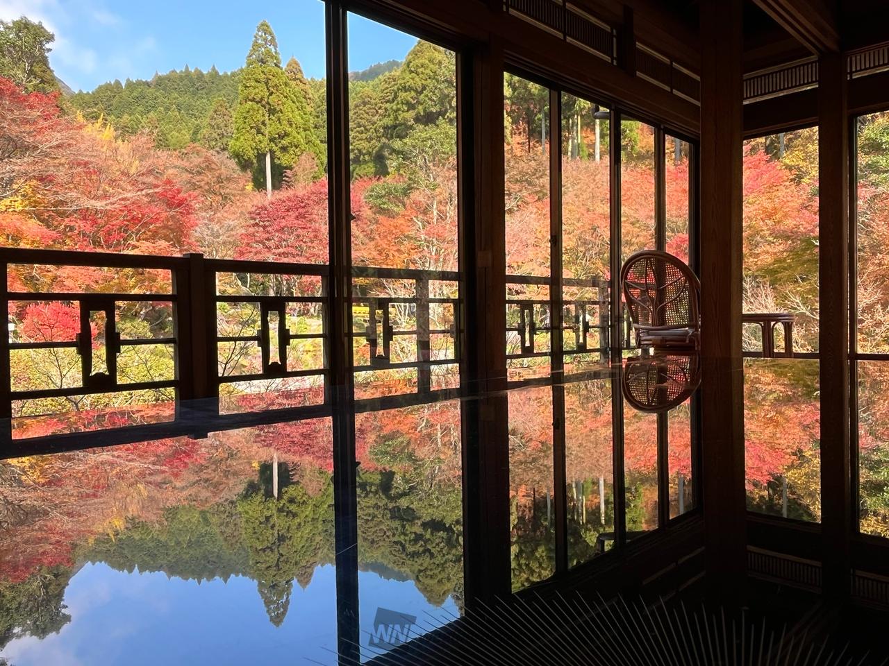 作礼山の中腹に位置し、その寒さ故に毎年美しい紅葉が楽しめます。散策15分コース、30分コース風遊山荘2Fでは外の景色が漆塗りのテーブルに映り込むリフレクション撮影が人気のスポットです。
