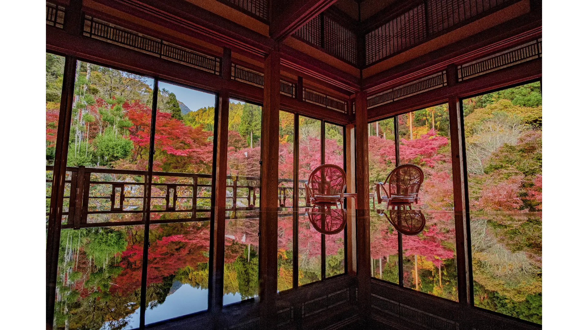 作礼山の中腹に位置し、その寒さ故に毎年美しい紅葉が楽しめます。散策15分コース、30分コース風遊山荘2Fでは外の景色が漆塗りのテーブルに映り込むリフレクション撮影が人気のスポットです。
