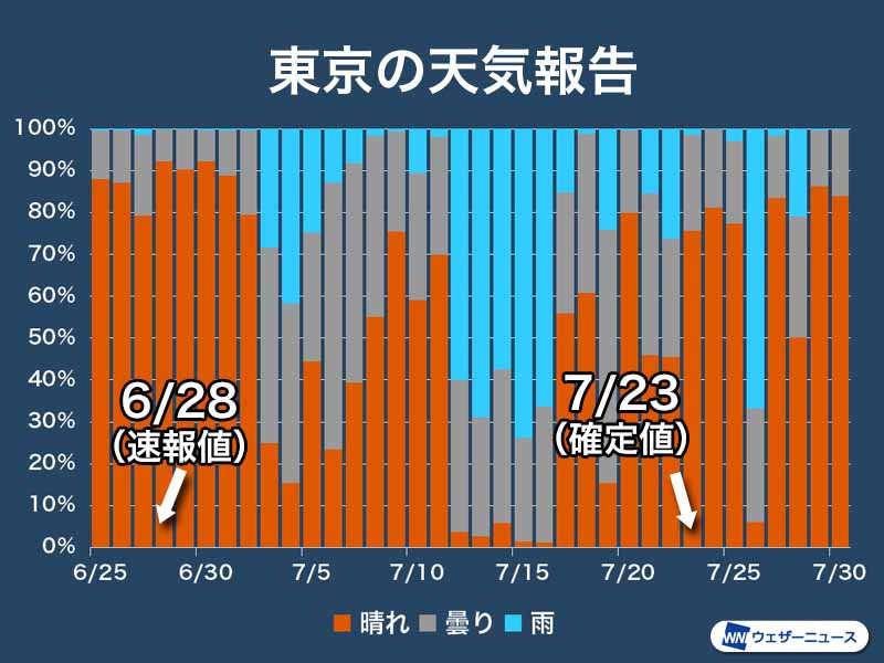 天気報告の経過から見ると、今回の修正は十分妥当性があるものの、6月下旬の暑さが記録的だったことや、7月中旬の崩れを一時的な梅雨の戻りと解釈すれば、速報値のタイミングも大きくは違わなかったとも考えられます。