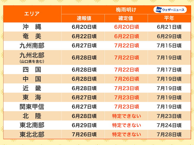 また、北陸と東北は梅雨明けの時期を特定できませんでした。