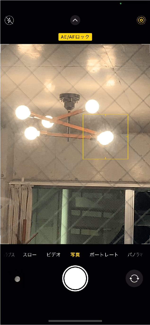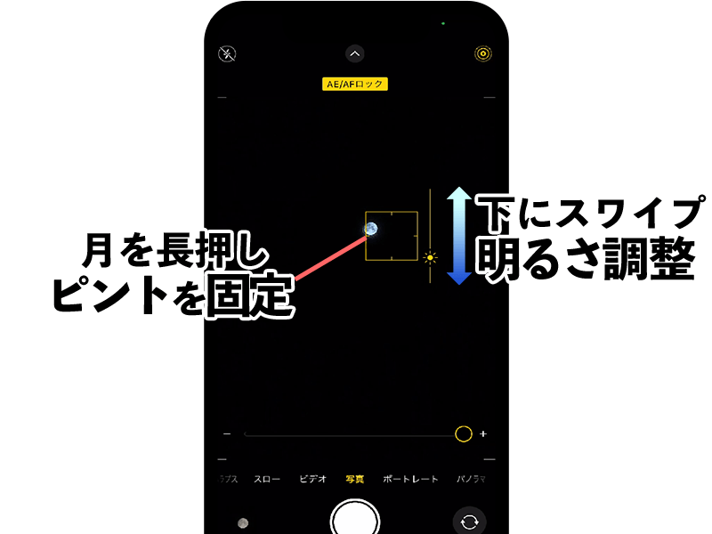 2)ピントを月に固定した状態で、ファーカスエリア(黄色い四角)の右側に出てくる太陽マークを上下させて明るさを調整します。下にスワイプすると画面が暗くなります。