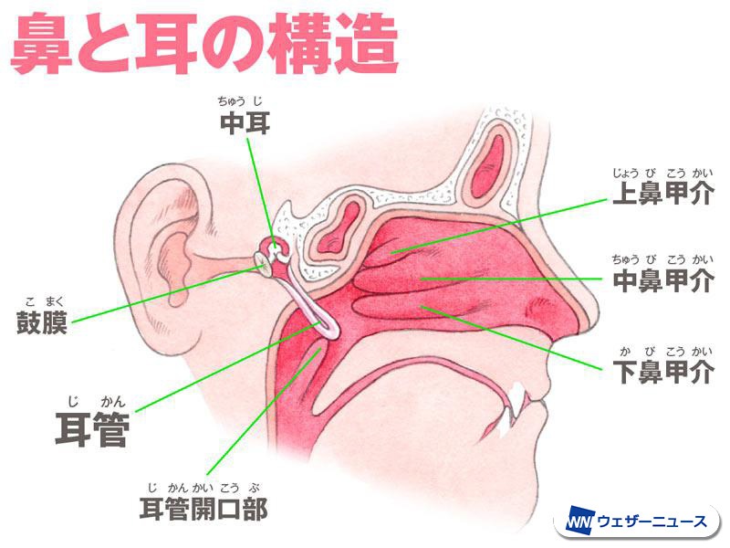 鼻すすりがよくない理由として、吸い込むときに耳に圧力がかかってしまうことがあります。鼻と耳は耳管(じかん)という管でつながっています。鼻をすするとき鼓膜に圧がかかり、内側にへこんでしまうのです。