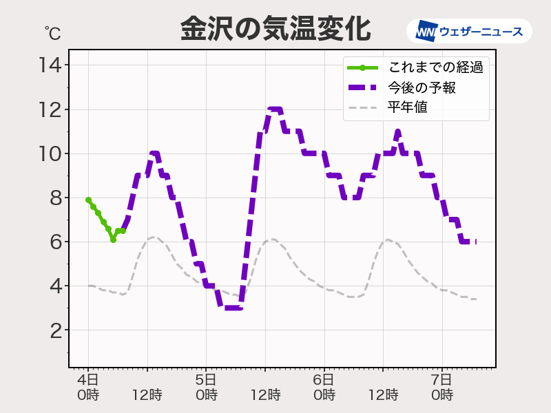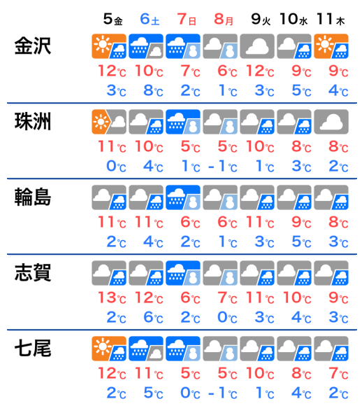 4日(木)の北陸は午前中を中心に雨が残るため、昼間もあまり気温が上がりません。夜は一段と冷え込むため、地震の被災地ではしっかりと寒さ対策をしてお過ごしください。
