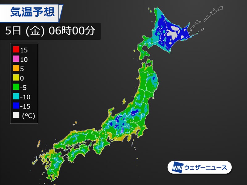 明日5日(金)の予想最低気温は東京3℃、さいたま-1℃、名古屋1℃、大阪3℃、広島1℃です。関東から西の太平洋側でも内陸部では0℃前後まで下がり、かなり寒く感じられそうです。