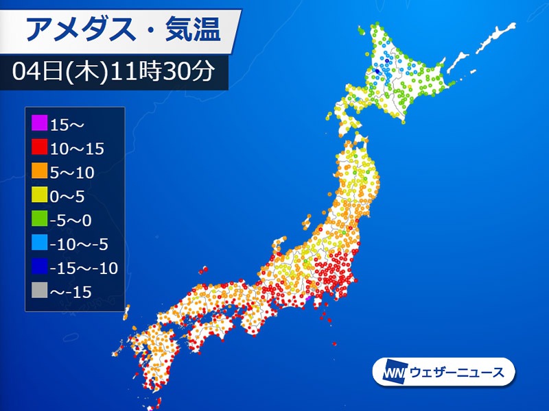 今日4日(木)は一時的に冬型の気圧配置となっていますが、強い寒気の南下はありません。