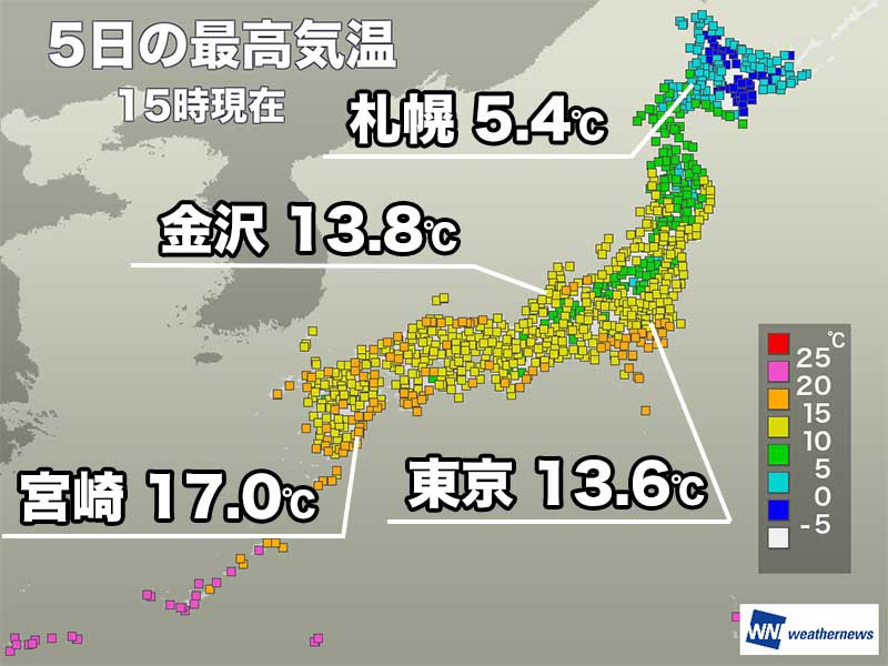 関東から西日本にかけては15℃前後の所が多く、東京都心は13.6℃、大阪市は13.5℃、宮崎市は17.0℃など、日差しの下では暖かく感じられるほどです。