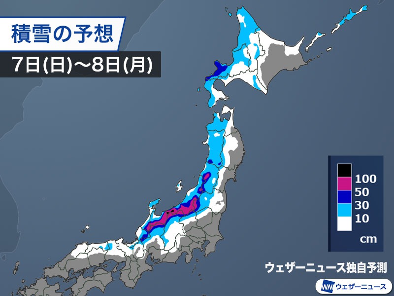 7日(日)〜8日(月)の2日間で予想される積雪の増加量は、北陸の山沿いで最も多く50cm以上に達するとみられます。東北や北海道でも30〜50cmの雪の積もる所がある見込みです。峠道では積雪の急増による車両滞留が発生しないよう、走行する際はスタックへの備えを万全に行ってください。