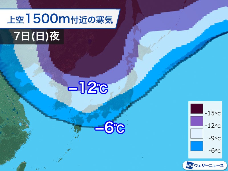 明後日7日(日)は低気圧が日本の東に進んで、西高東低の冬型の気圧配置になります。寒気は明後日の夜から8日(月)・成人の日の朝にかけて最も南下し、平地で雪になる目安の−6℃以下が西日本、東日本の太平洋側まで、さらに強い−12℃以下が東北北部まで南下する見込みです。