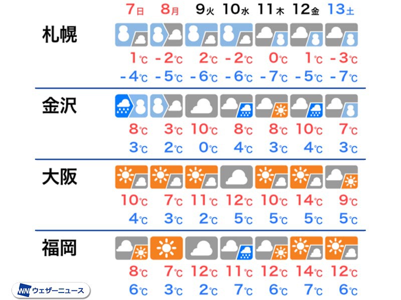 地震被災地の北陸は来週前半の変化が大きく、金沢市の最高気温は8日(月)が3℃なのに対し、9日(火)は10℃まで上がる見込みです。避難生活や復旧作業で体に負担がかかっている所に気温の変化が加わりますので、うまく体を休めるようにしてください。