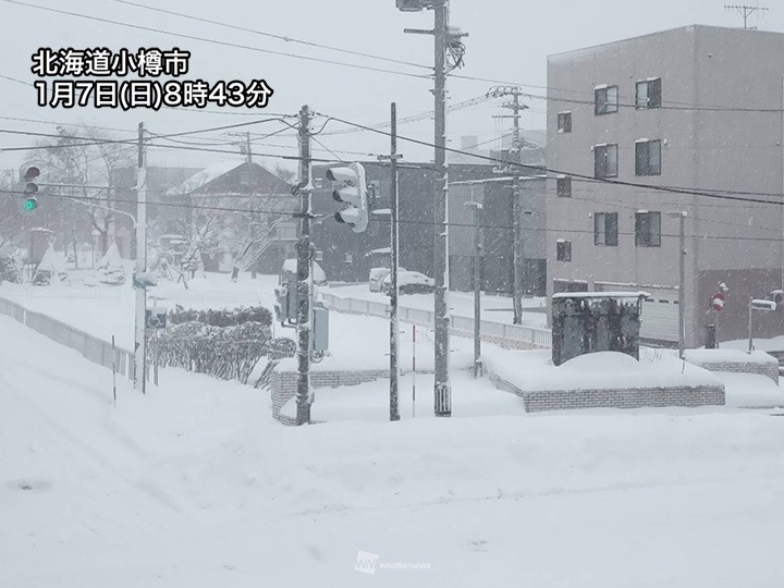 特に後志地方で積雪の増加が目立ち、小樽市では1〜7時の6時間で20cm、赤井川村では0〜6時の6時間で17cmの雪が一気に積もりました。札幌市内では晴れ間が見えていて、今日の雪は非常に狭い範囲で強まっていることがわかります。