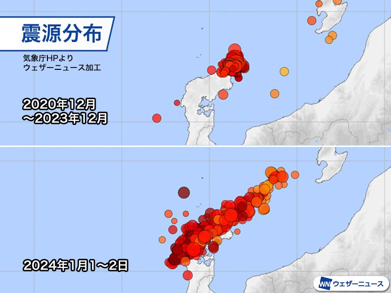 今回の地震は昨年までの活動域を含んでいますが、その領域は段違いの広さです。2020〜2023年にかけての活動はおおよそ30km四方の範囲内だったのに対し、今回は北東〜南西方向に150km以上の広範囲になっています。