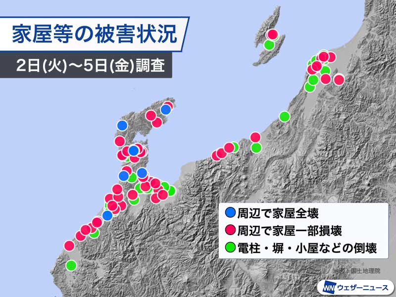 家屋に損壊が出ているのは石川県全域や富山県東部など、震度5強以上の揺れになった地域で目立っています。また、震源域からは少し離れた新潟市など越後平野でも被害が多くなりました。新潟市では液状化現象が発生した所が多く、それによって家屋などに影響が出たと考えられます。