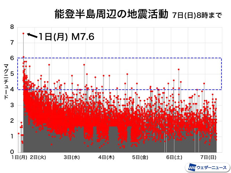 マグニチュード7.6の地震が発生してから1週間近くが経過しても、活動は活発な状況が続いています。発生直後に比べると少なくなったとは言え、震度1以上を観測する有感地震は6日(土)も50回を上回る水準です。