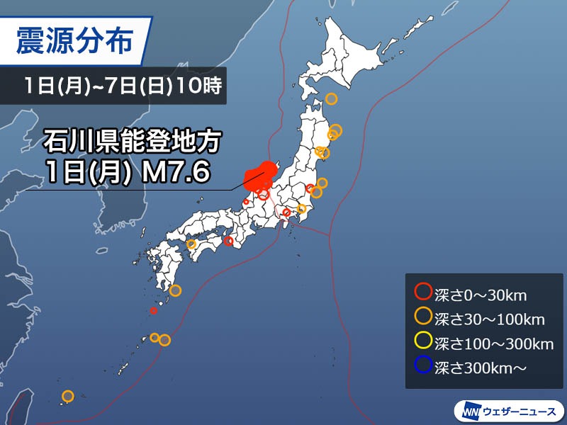 1月1日(月)16時10分頃、石川県能登半島を震源とするマグニチュード7.6、深さ16kmと推定される地震が発生しました。