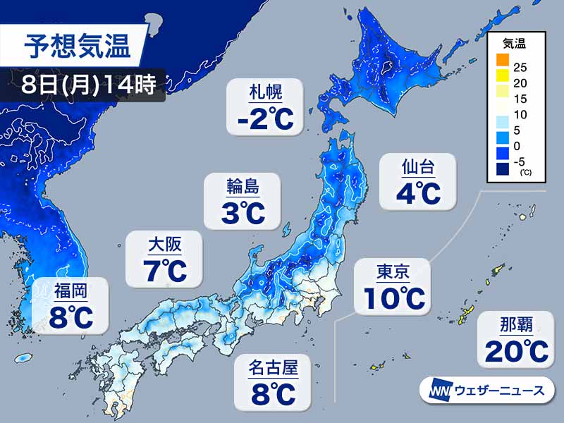 寒気の影響が残っているため全国的に昼間も気温はあまり上がらず、真冬の寒さの一日となります。最高気温が10℃に届くところはわずかで、ほぼ全国的に一年のうち最も寒い頃の寒さとなる予想です。