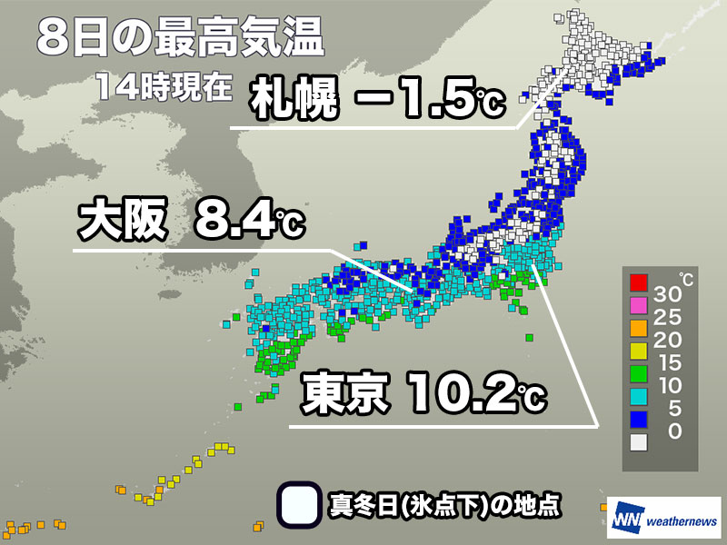 東京の最高気温は10.2℃。沖縄を除くと最高気温が10℃を超えたのは関東や東海、西日本太平洋側のごく一部の地域に限られました。札幌の最高気温はマイナス1.5℃で元日以来、1週間ぶりの真冬日です。